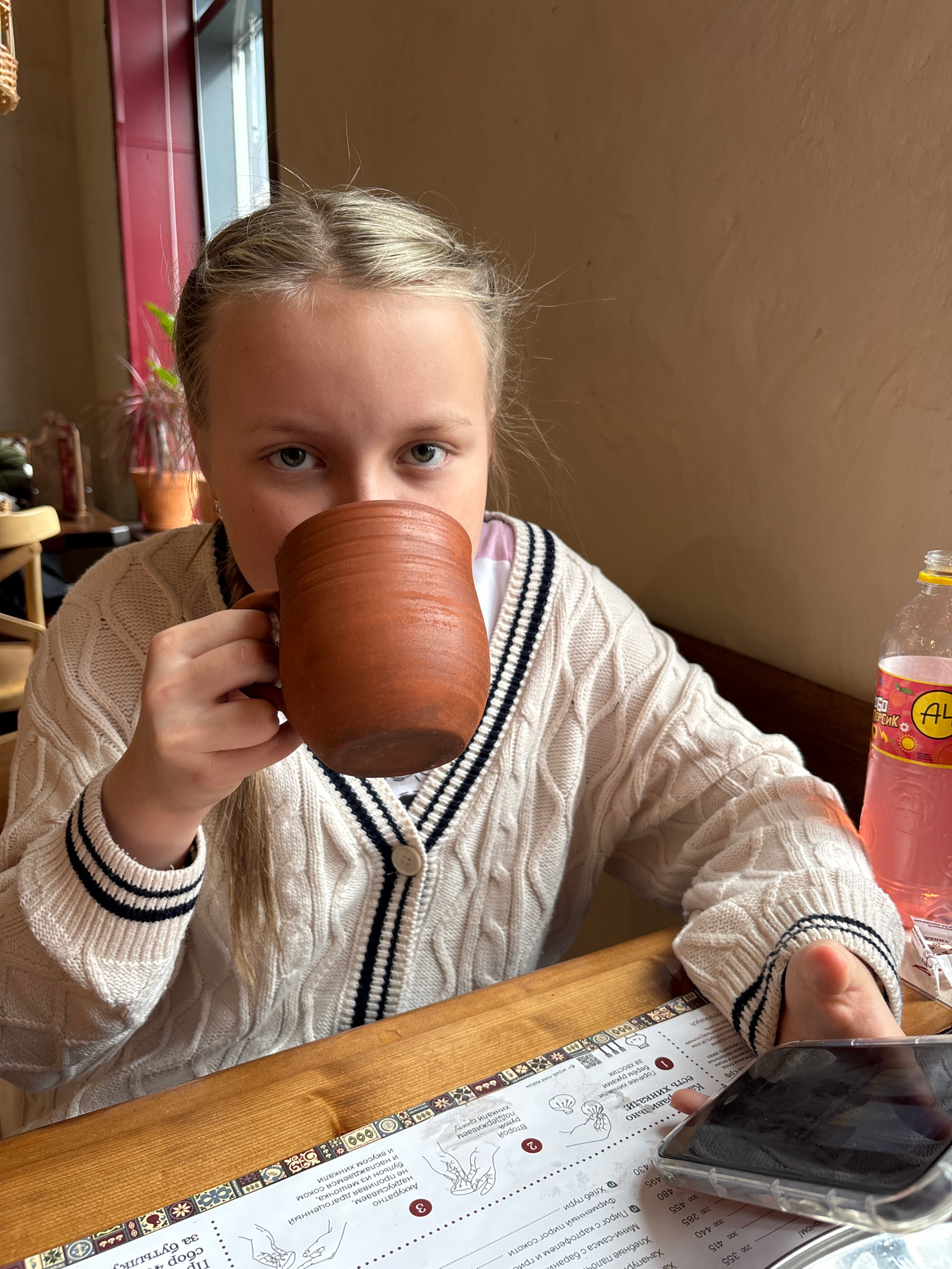 A young, fair-skinned person with blond hair is holding a brown clay mug and drinking from it, looking directly at the camera. The person is wearing a white cable-knit cardigan with dark blue and whit…read more