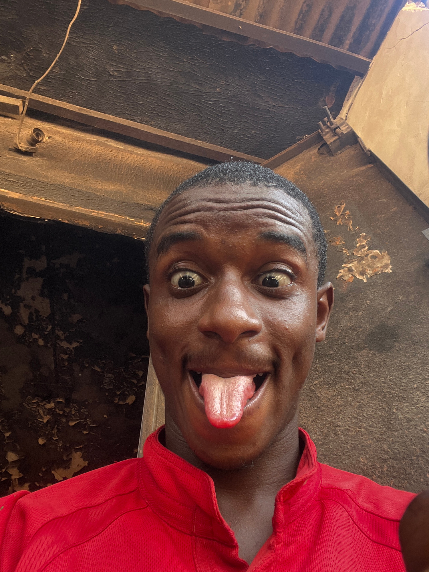 A young man with dark skin wears a red shirt and sticks his tongue out. He is positioned under an unfinished ceiling with exposed beams and electrical wiring. The background suggests an indoor settingβ¦read more
