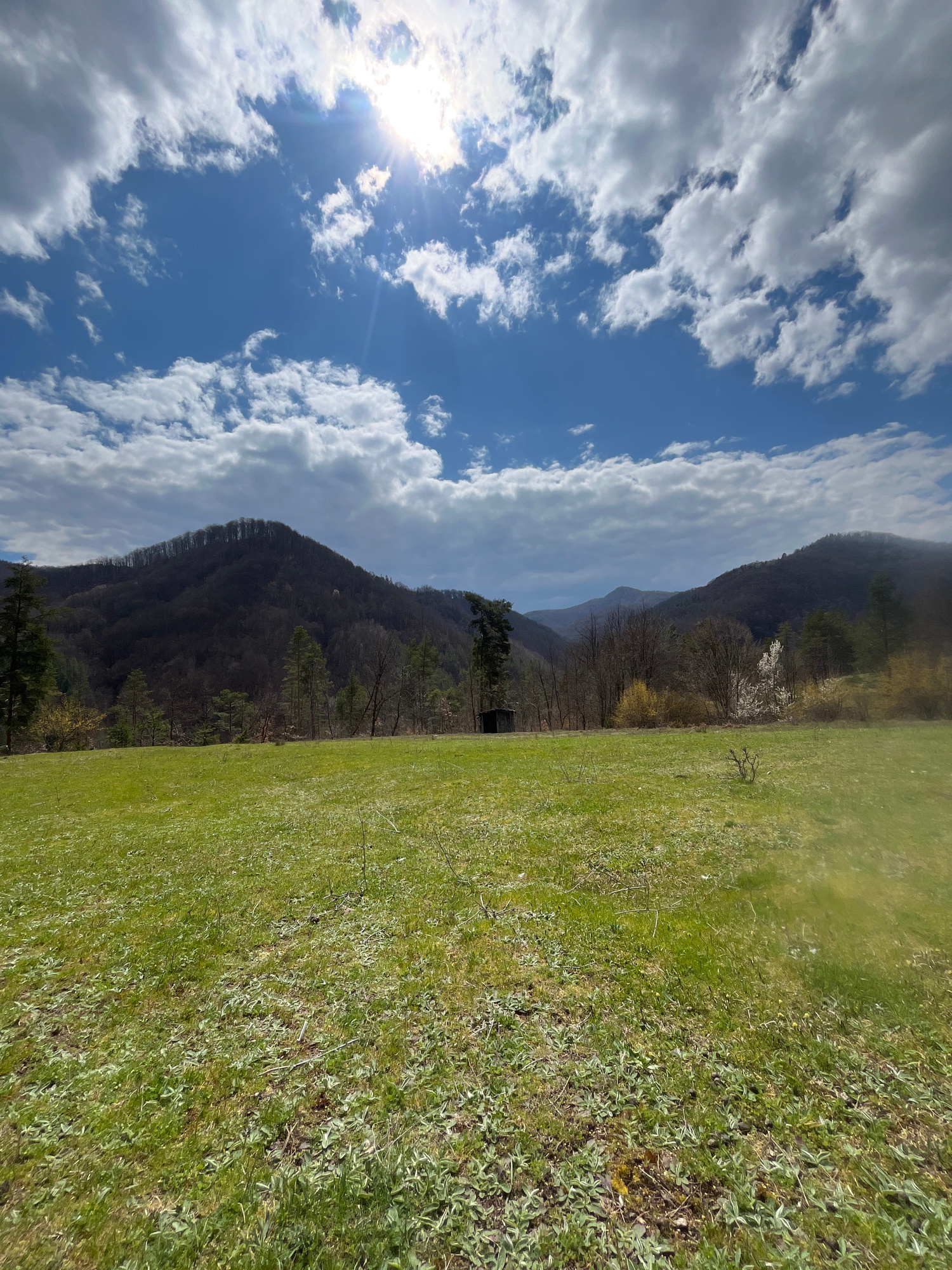 The image presents a landscape, presumably in the vicinity of Srednogortsi, Bulgaria, given the request. It features a clear blue sky with scattered cumulus clouds and visible sunlight. Adjacent to th…read more