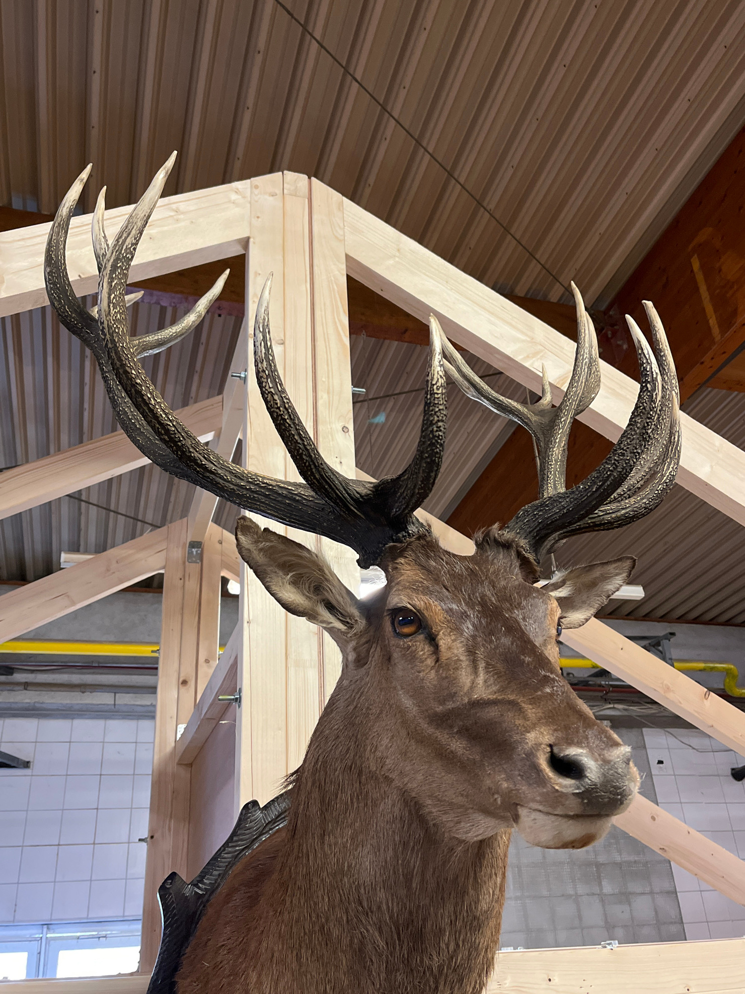 A mounted deer head is the central subject of the image, displaying full antlers. The deer has brown fur and is mounted on a light-colored wooden frame constructed of planks. The background includes a…read more