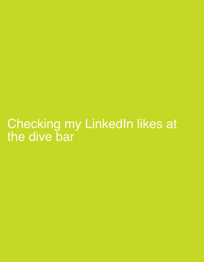 The image contains the text "Checking my LinkedIn likes at the dive bar." The background is a solid yellowish-green color. There is no other information to suggest this image is set in New York City.