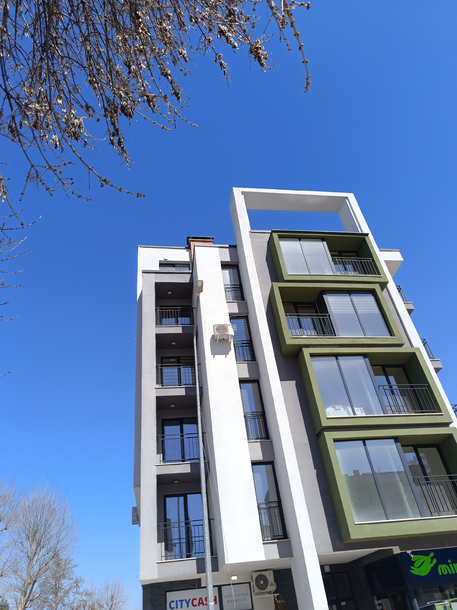 A low-angle, daylight shot shows a modern apartment building in Pleven, Bulgaria, characterized by white, gray, and olive green geometric shapes framing large windows and balconies. The building appea…read more