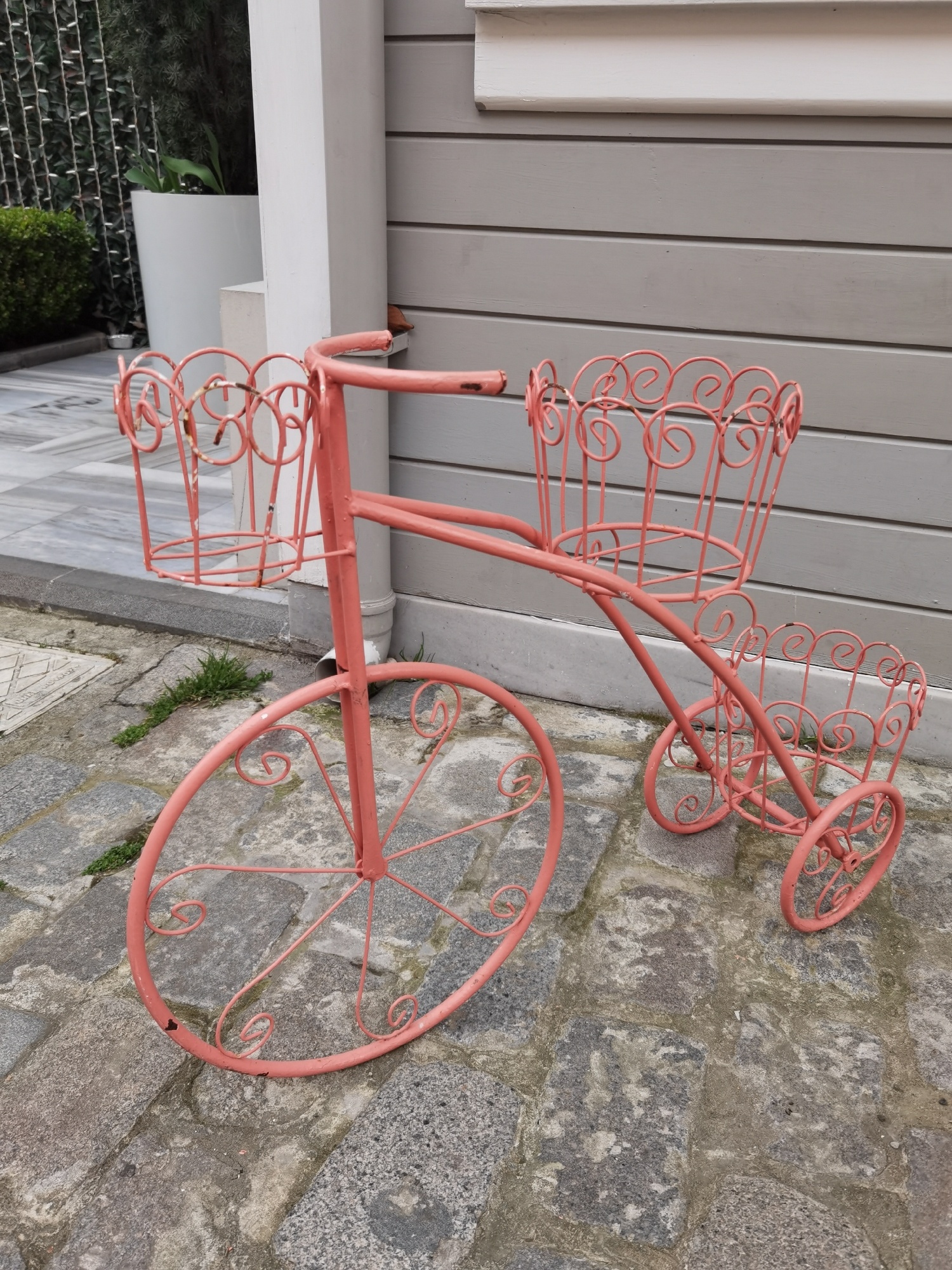 A pink metal tricycle with three basket-shaped compartments is standing on a paved surface. The tricycle has one large wheel in the front and two smaller wheels in the back. The baskets are decorated…read more