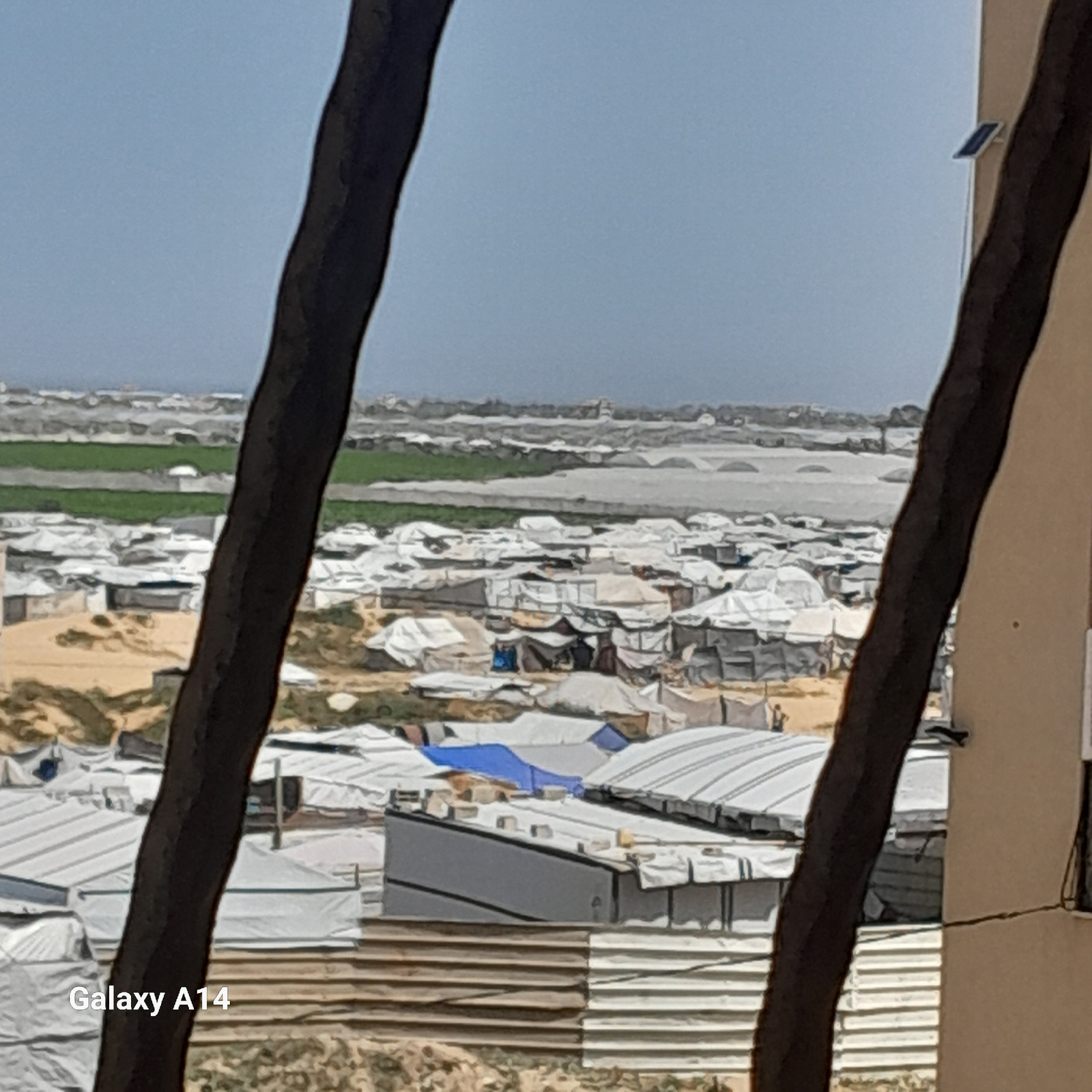 The image shows a densely populated area, likely a refugee camp, in Khan Yunis, Palestinian Territory. Numerous makeshift shelters, primarily white and gray tarpaulin tents, cover the landscape. Some…read more