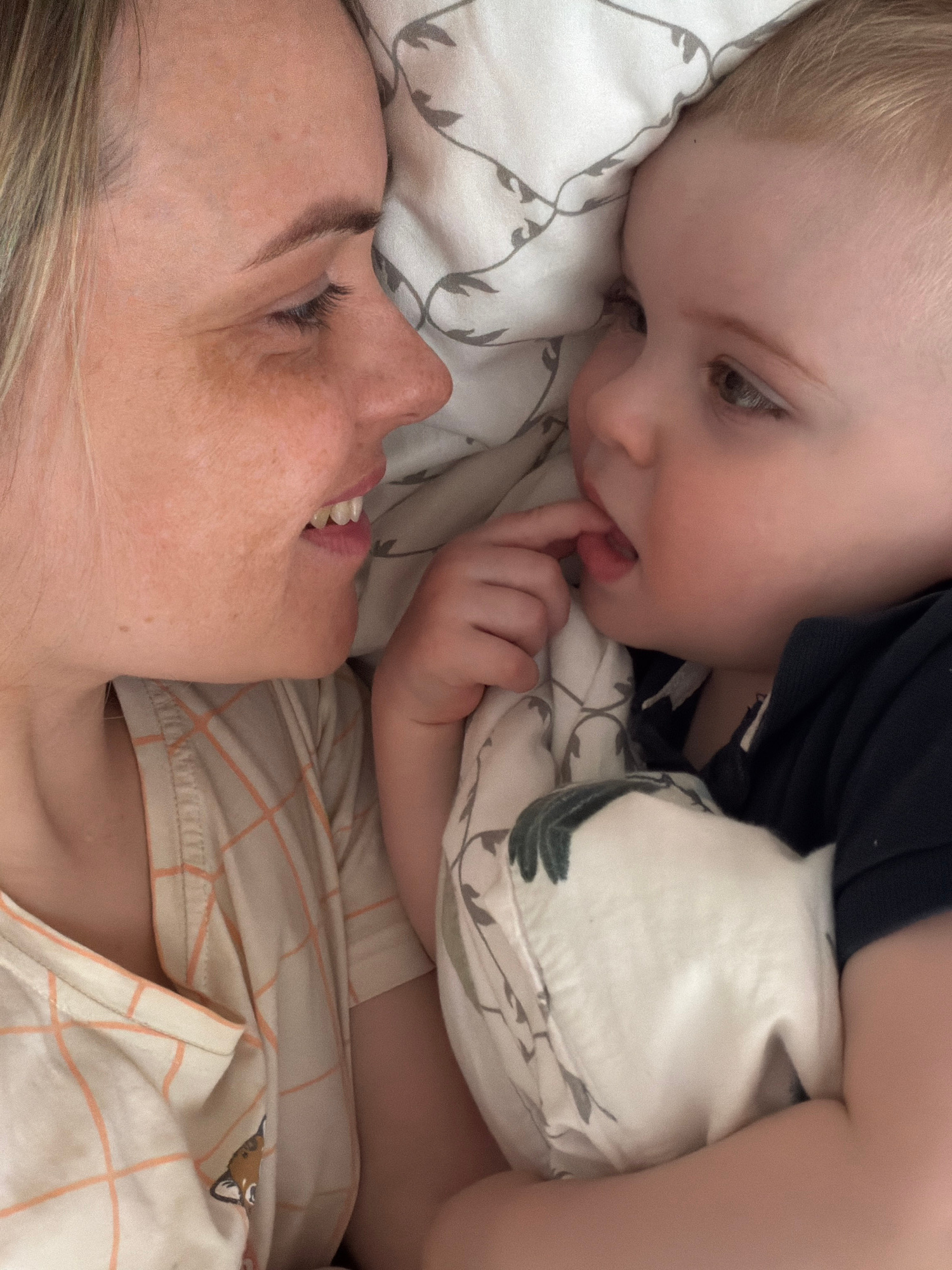 A close-up shot from an oblique angle captures a mother and her child lying on a bed with patterned bedding. The mother's face is prominently visible, showing freckles and blonde hair. She is looking…read more