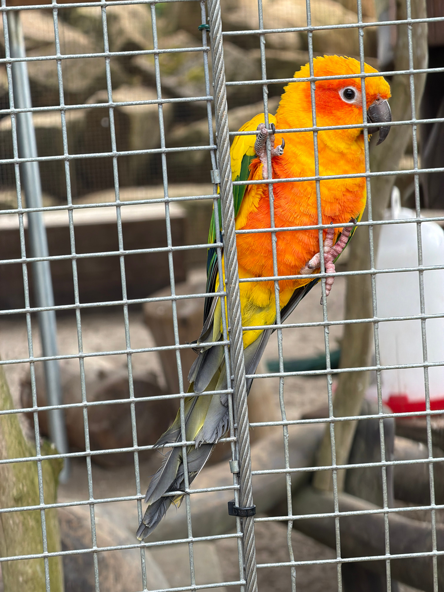 A vibrant sun conure is seen inside a metal cage, seemingly at a zoo. The bird is perched on the cage bars with its claws gripping the metal. Its plumage is bright yellow and orange on its head and bo…read more