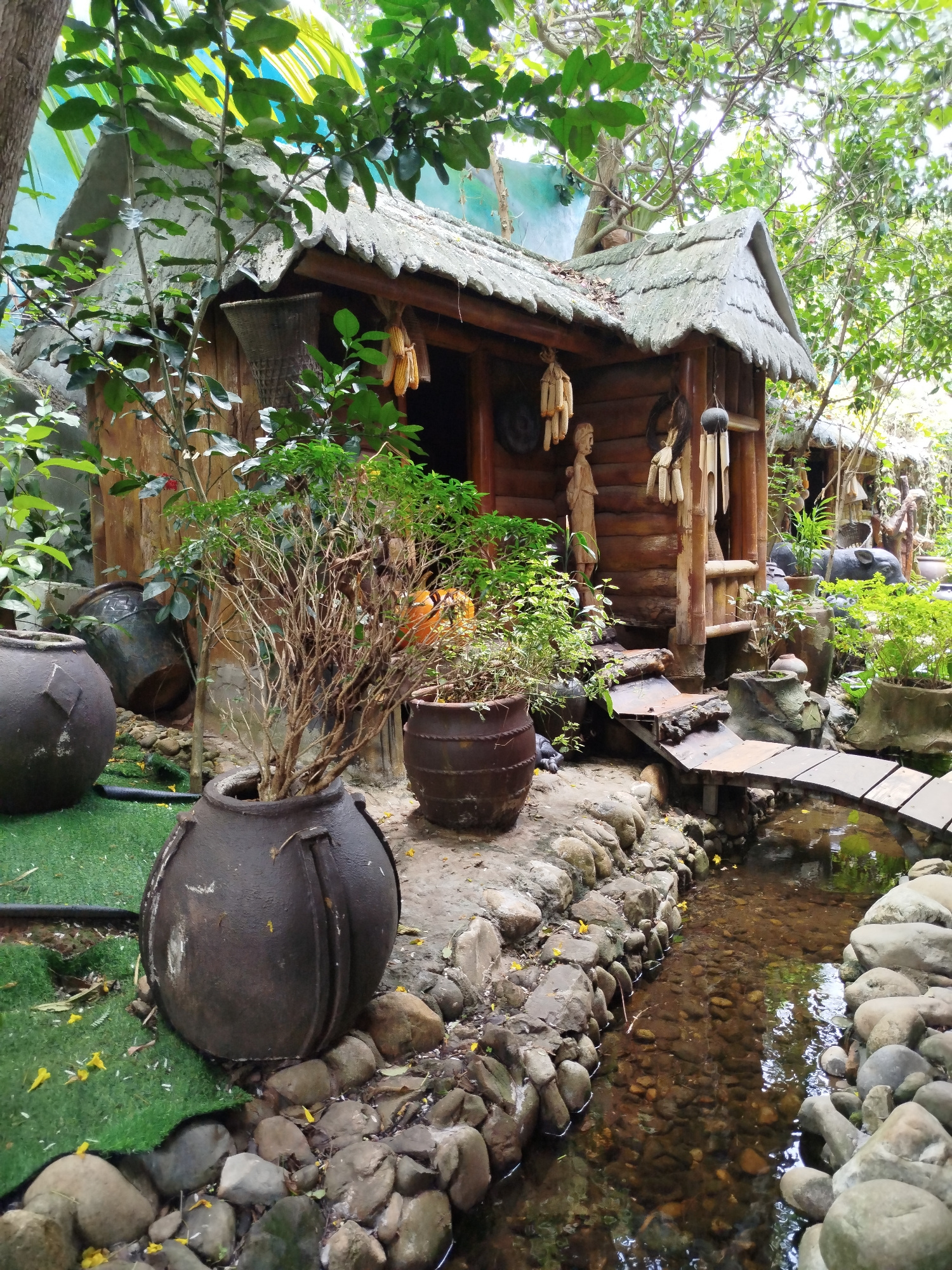 This media file captures a serene, rustic outdoor scene, likely a decorative garden or display in Thôn 3, Vietnam. The central subject is a small, traditional-style wooden house with log walls and a t…read more