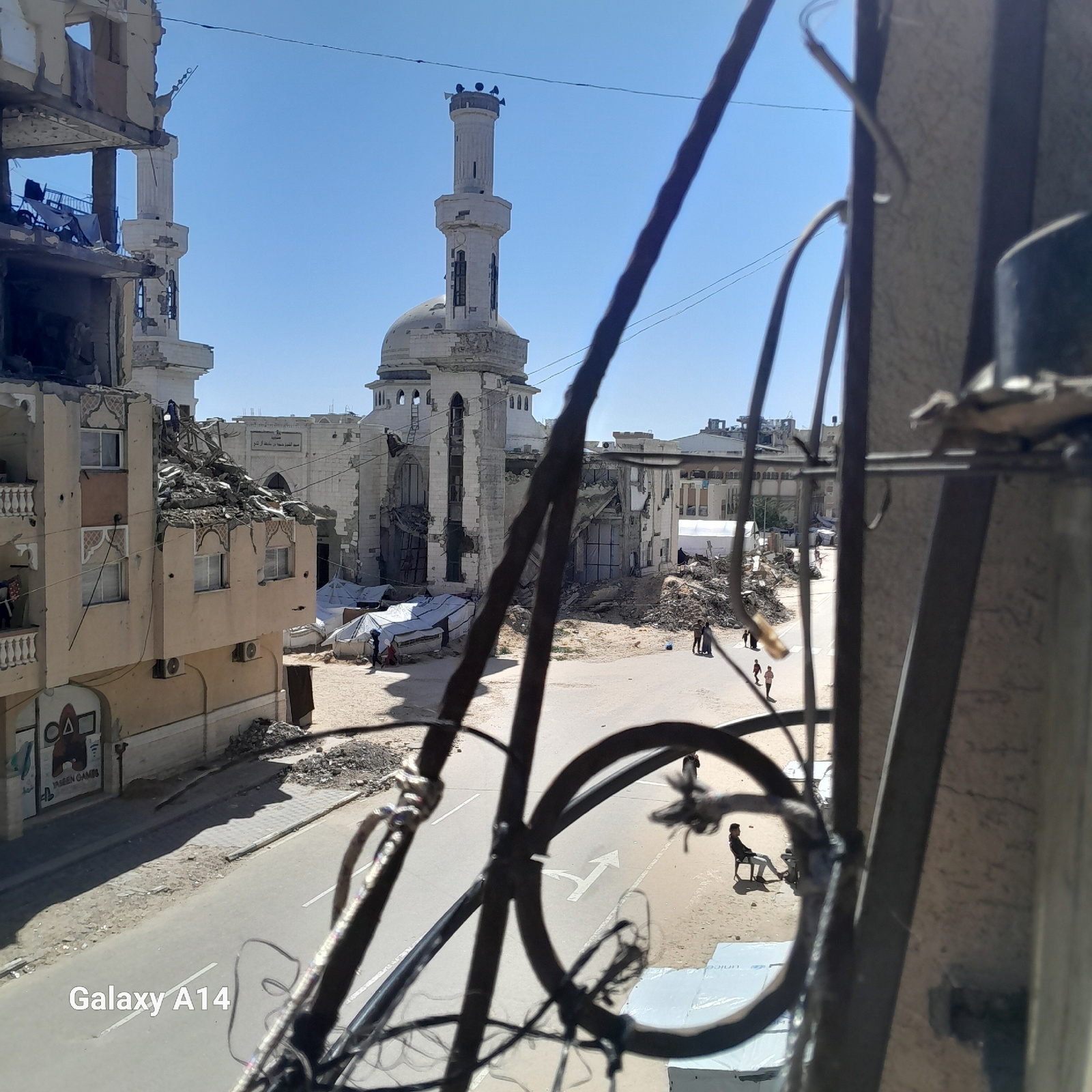 The image displays a destructed urban landscape in Khan Yunis, Palestinian Territory, viewed from an elevated position through a dark, blurred metal grille. In the mid-ground, the severely damaged Al-…read more