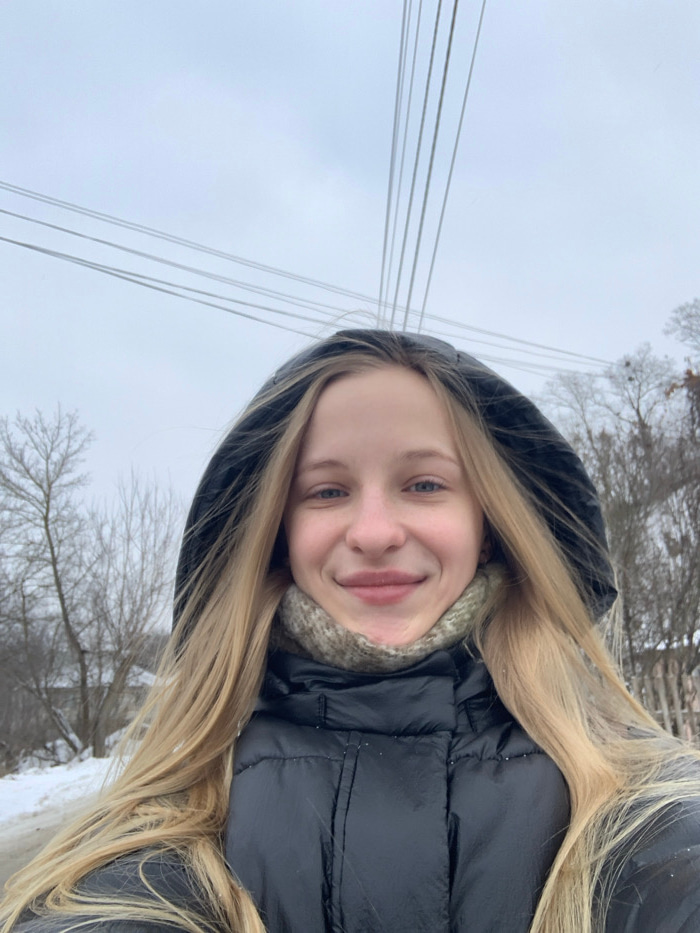 A young female with long blonde hair, blue eyes, and a smiling expression is captured in a self-portrait taken outdoors in Bohuslav, Ukraine. She is wearing a black hooded puffer jacket, with the hood…read more
