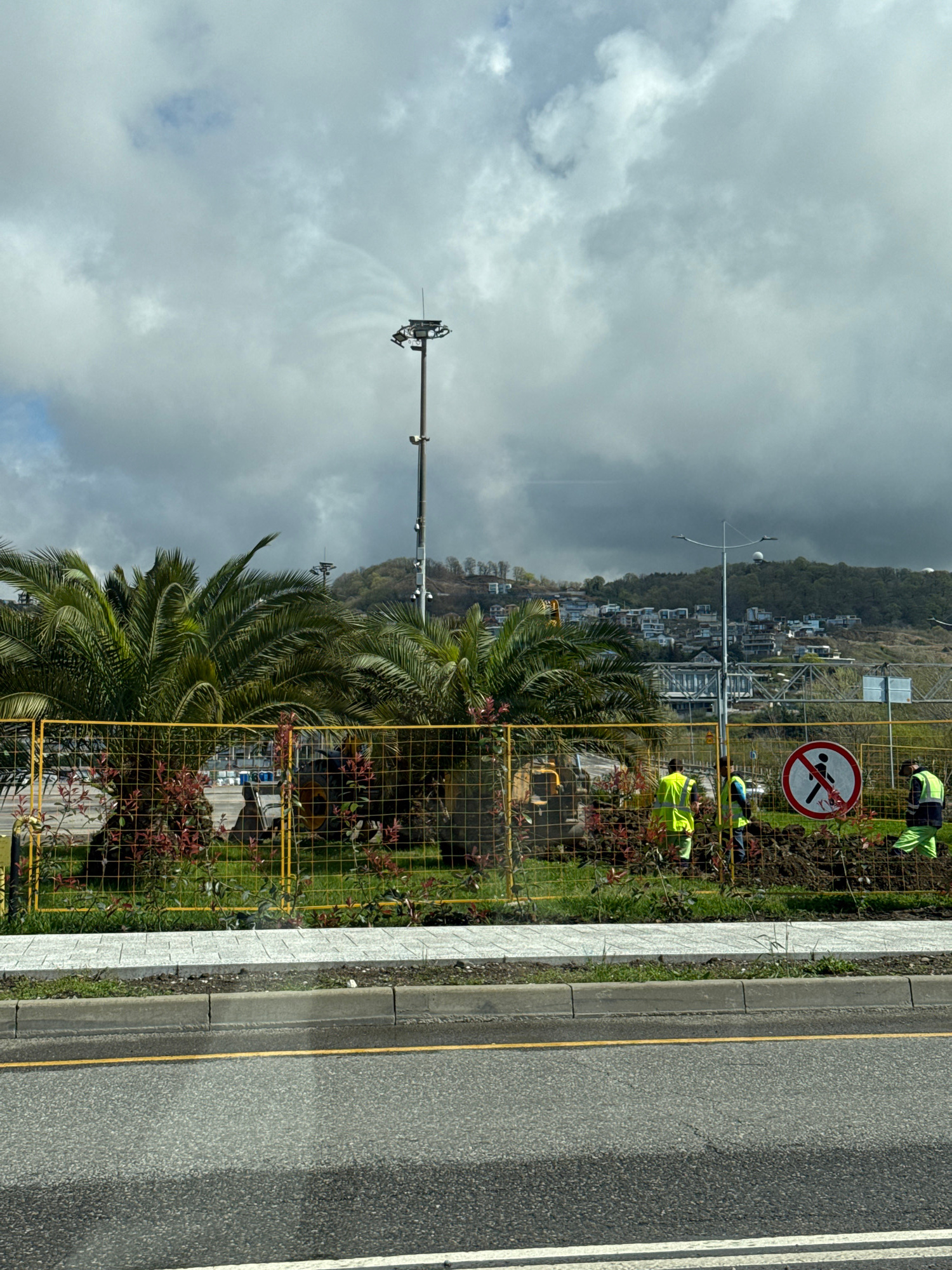 The scene is located in Sirius, Russia. A yellow wire fence separates a landscaped area with palm trees and other vegetation from a road. Two workers wearing high-visibility vests are present within t…read more