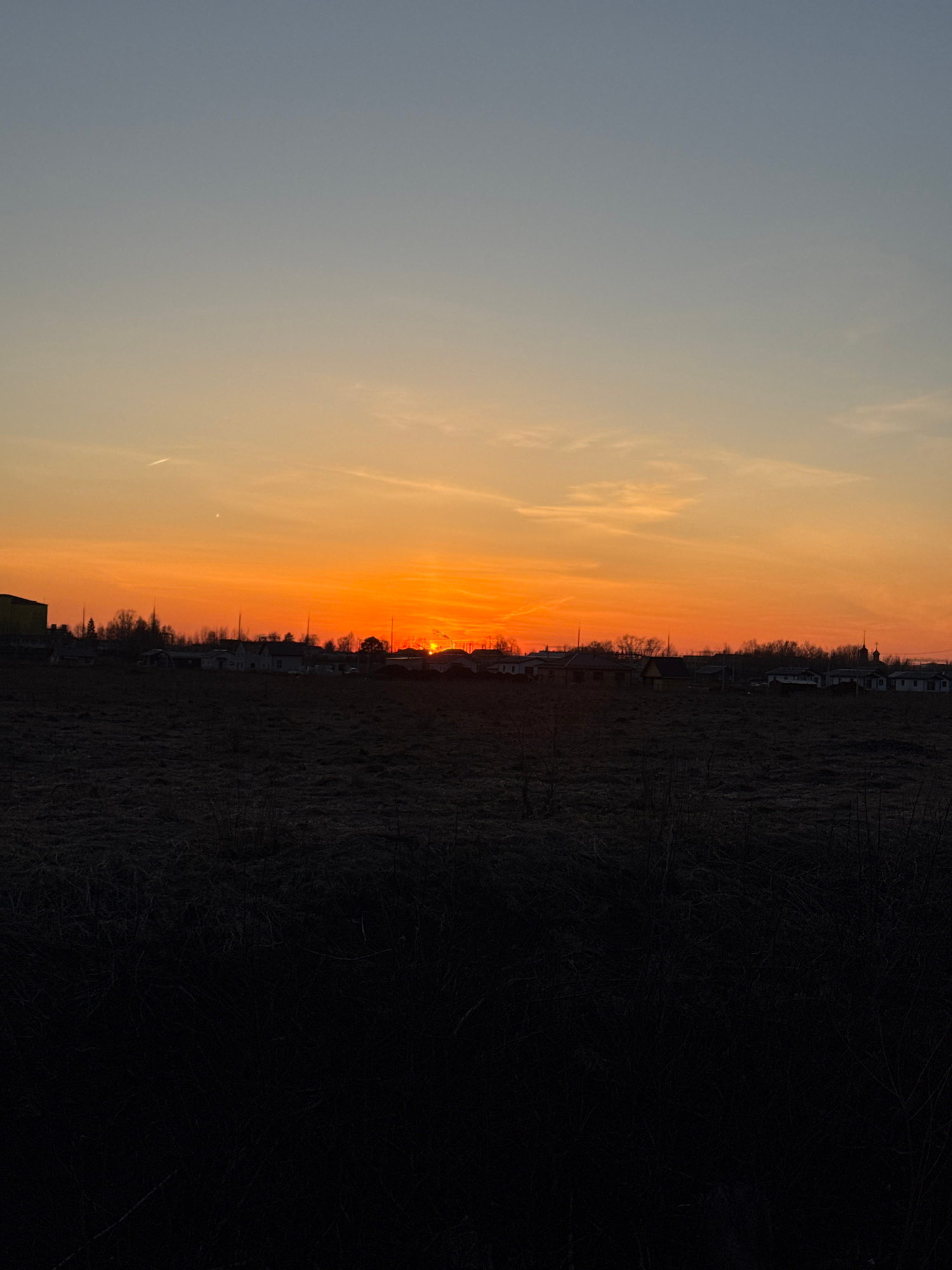 The image captures a sunset over a landscape in Горный, Russia. The sky transitions from a light blue at the top to orange and yellow near the horizon, where the sun is setting. The foreground is prim…read more