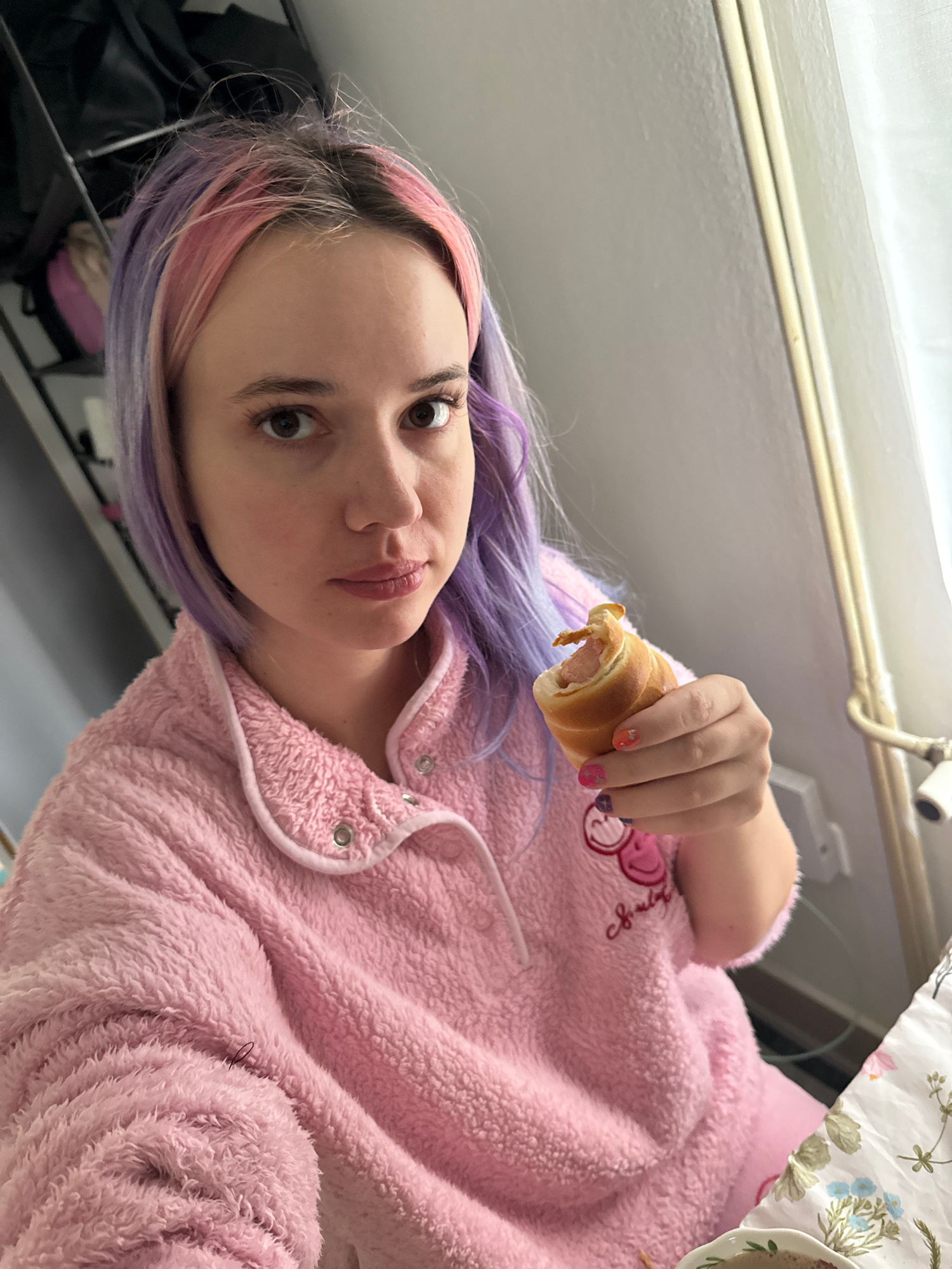 A female individual with light skin tone and bi-colored hair, dyed pink and purple with visible natural root growth, is depicted indoors, likely in a private residence within the City of Zagreb, Croat…read more