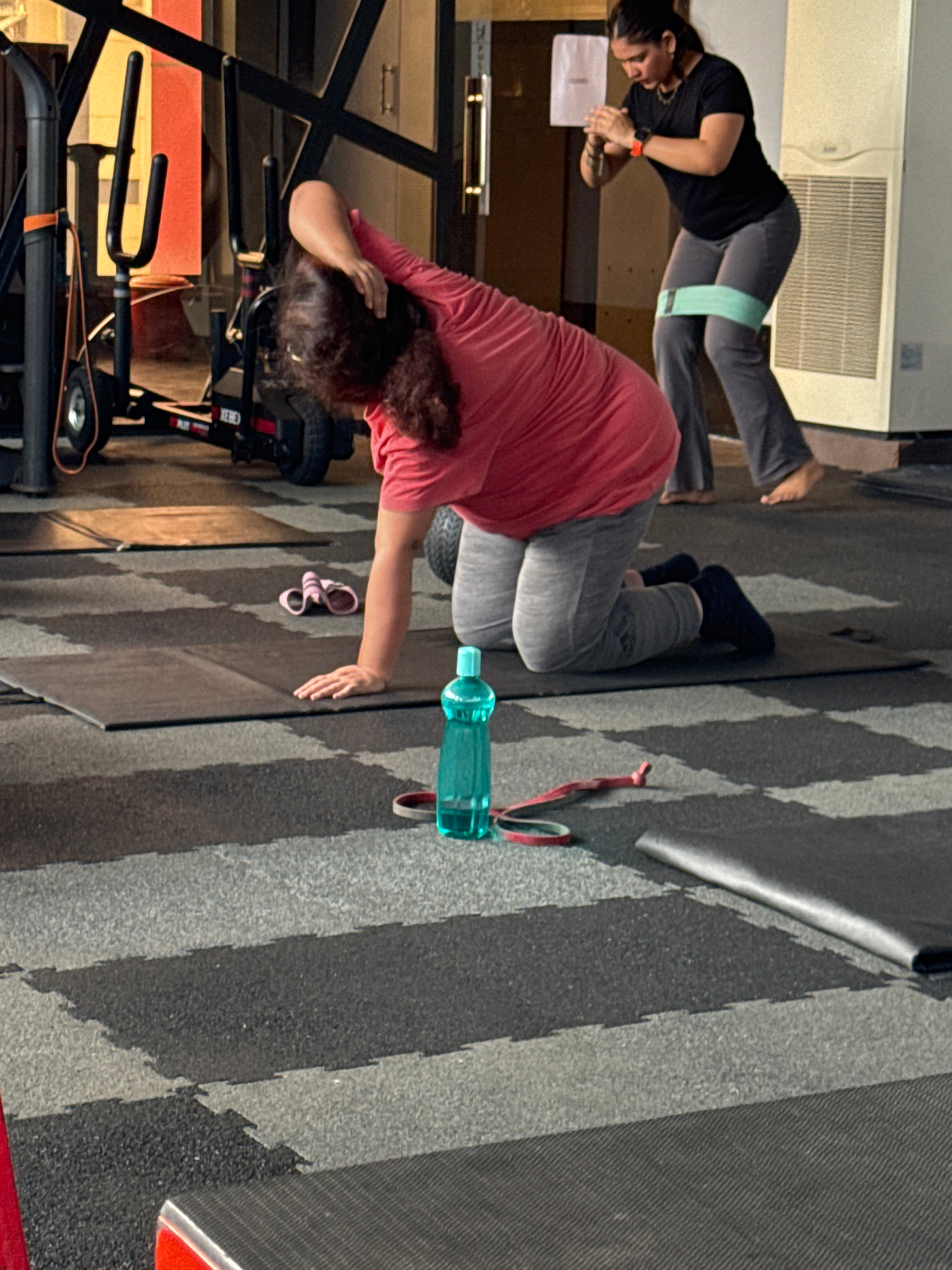 This image captures an indoor fitness setting, likely a gym or workout studio, featuring two women engaged in exercise. The floor is covered with distinctive interlocking grey and black patterned matsβ¦read more