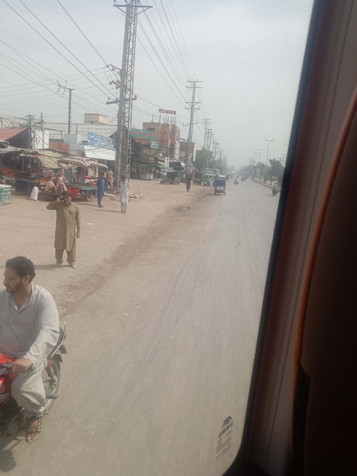The image depicts a street scene in Chak 135/9 L, Pakistan. The view is likely taken from inside a vehicle, with a portion of the car door/frame visible on the right. A two-lane road stretches into t…read more