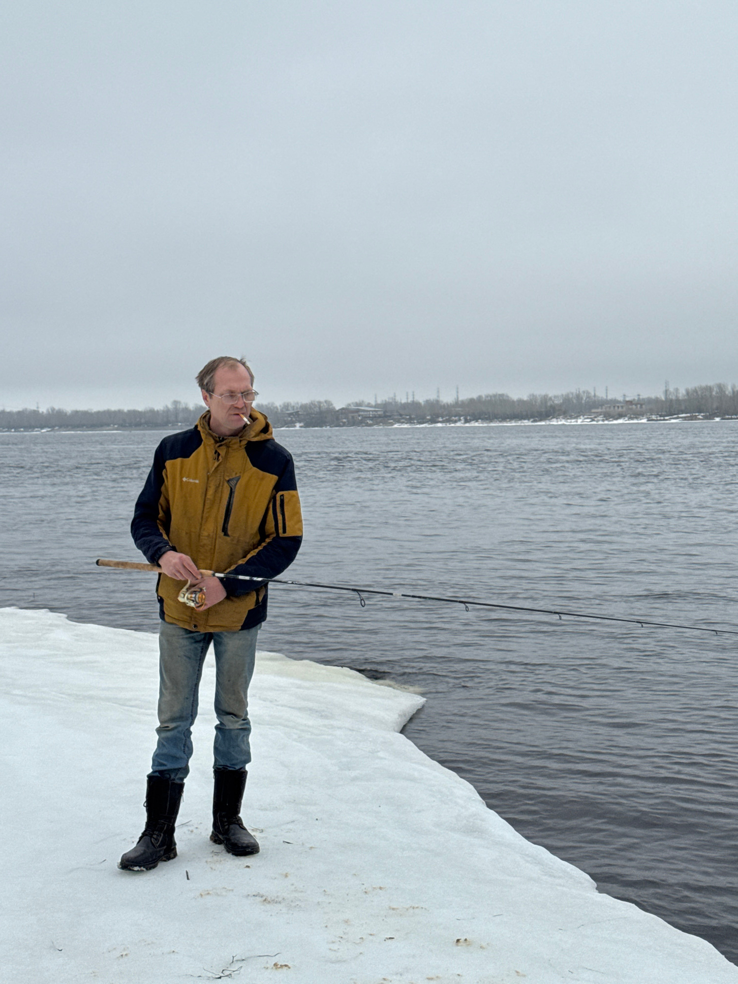 A man stands on a snowy bank, holding a fishing rod. He wears a tan and black jacket, blue jeans, and black boots. He appears to be smoking a cigarette. In the background, there's a body of water andβ¦read more