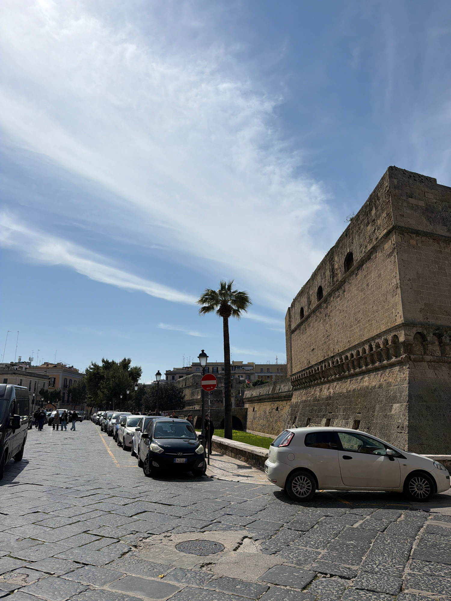 The image shows a street in Bari, Italy. A large, stone medieval castle is on the right side of the image. A row of parked cars lines the street, with a white car closest to the viewer. Across the str…read more