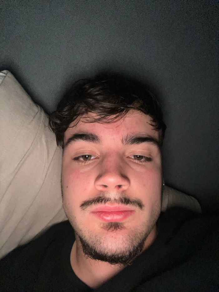 The image depicts a close-up, head-and-shoulders portrait of a young adult male in an indoor setting in Vila Real, Portugal. The male has dark, wavy hair styled forward, light brown eyes with a relaxe…read more