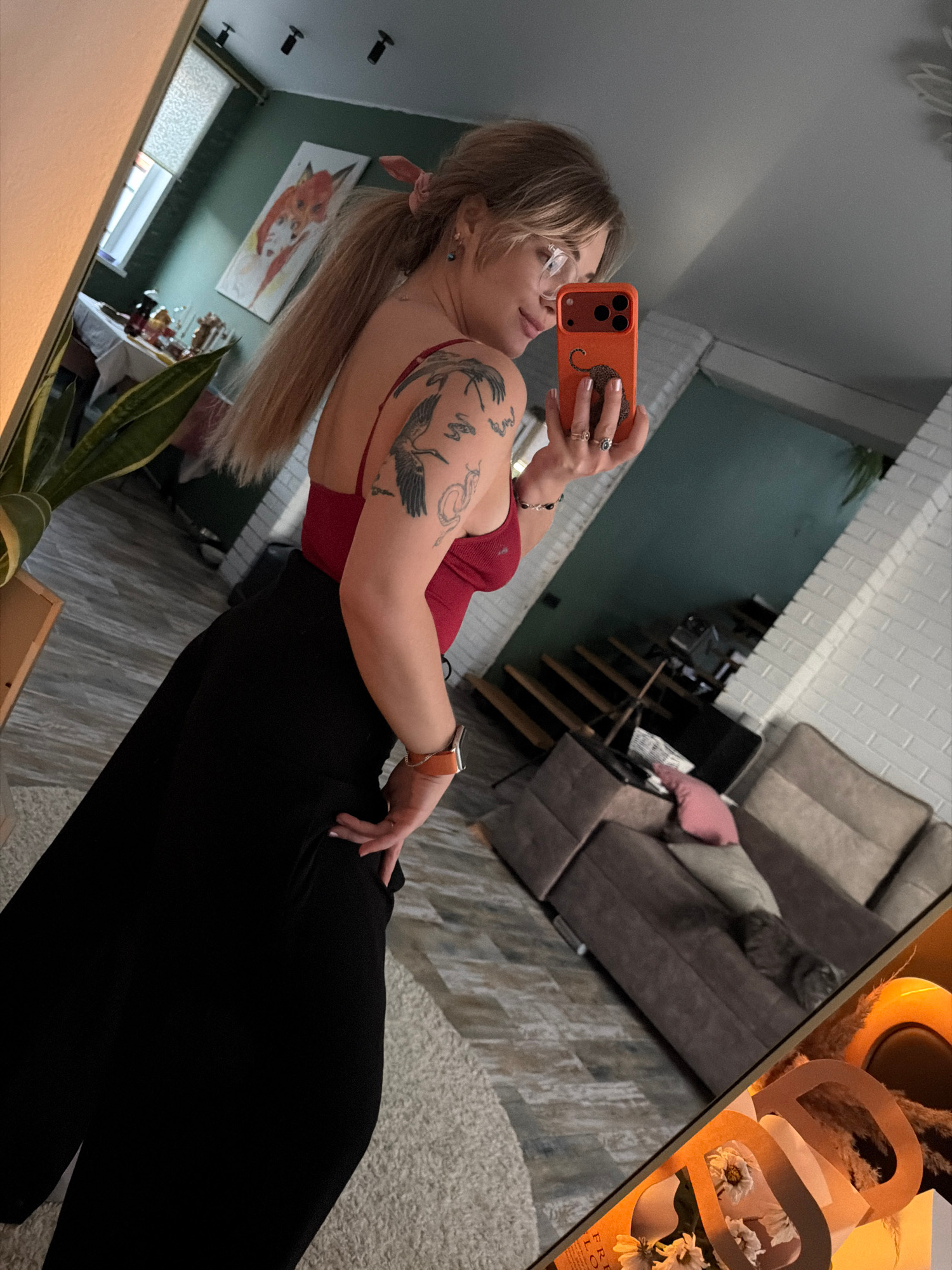 A woman is taking a mirror selfie indoors. She is wearing glasses, a red top, and black pants. She has blonde hair tied back with a pink scrunchie and tattoos on her arm. She is holding an orange smar…read more