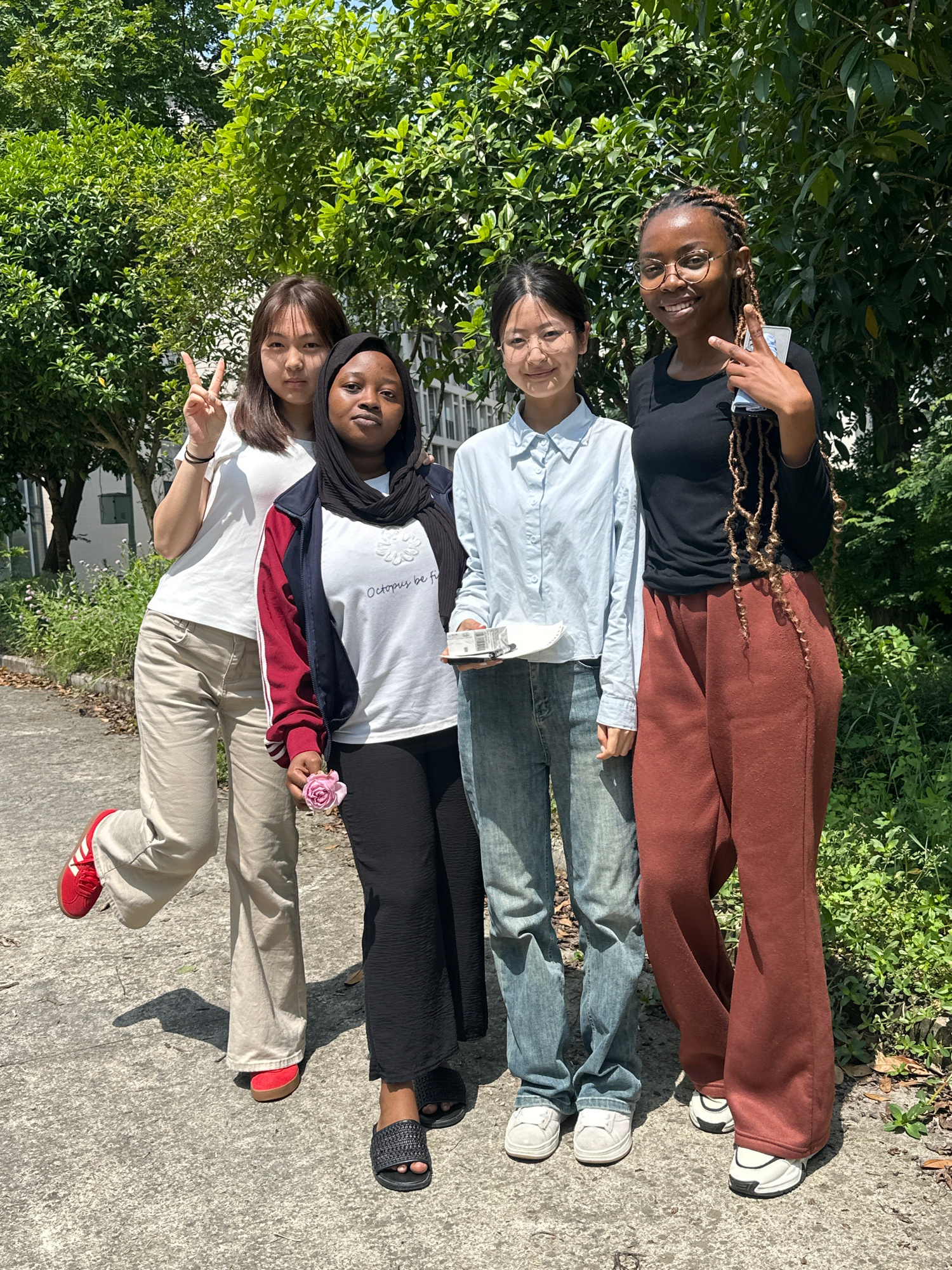 The original image, oriented sideways, depicts four young women posing for a photograph outdoors on a bright, sunny day in what appears to be Jiangjin, China. They are standing in a line on a concrete…read more