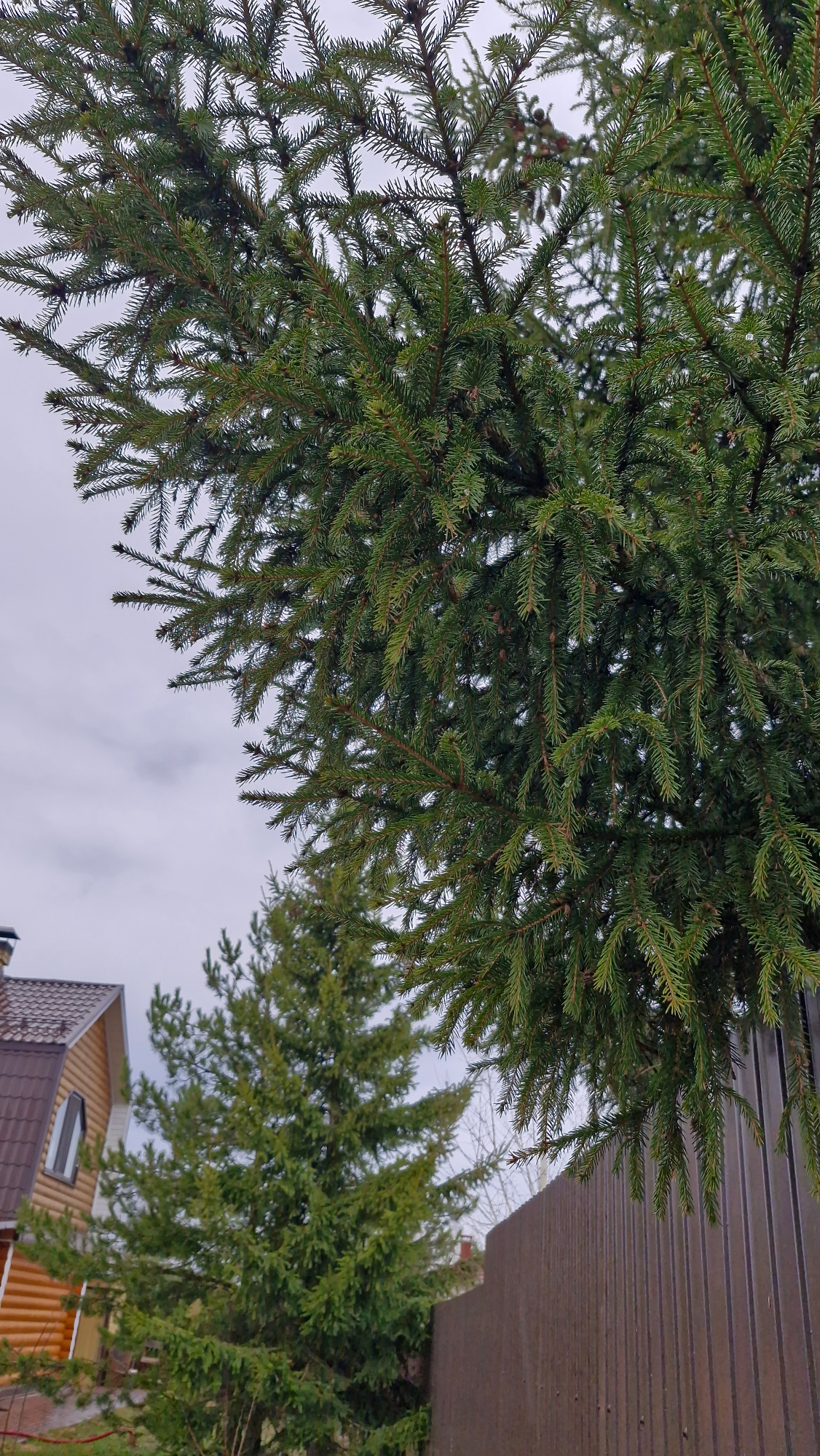 The image shows an upward view through the branches of a coniferous tree towards a grey sky. To the right, part of a building with a brown roof and beige siding is visible, along with more greenery thβ¦read more
