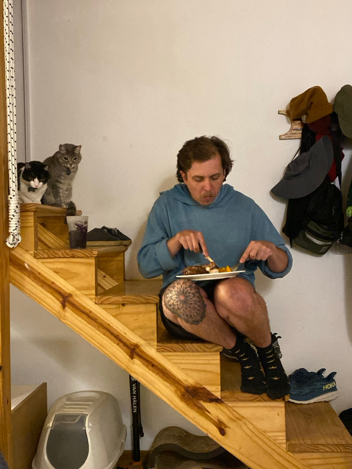 A man sits on wooden stairs, eating from a plate with a fork. He wears a blue shirt, black shorts, and patterned socks, and has a circular tattoo on his thigh. Below him, two cats sit on the stairs. A…read more
