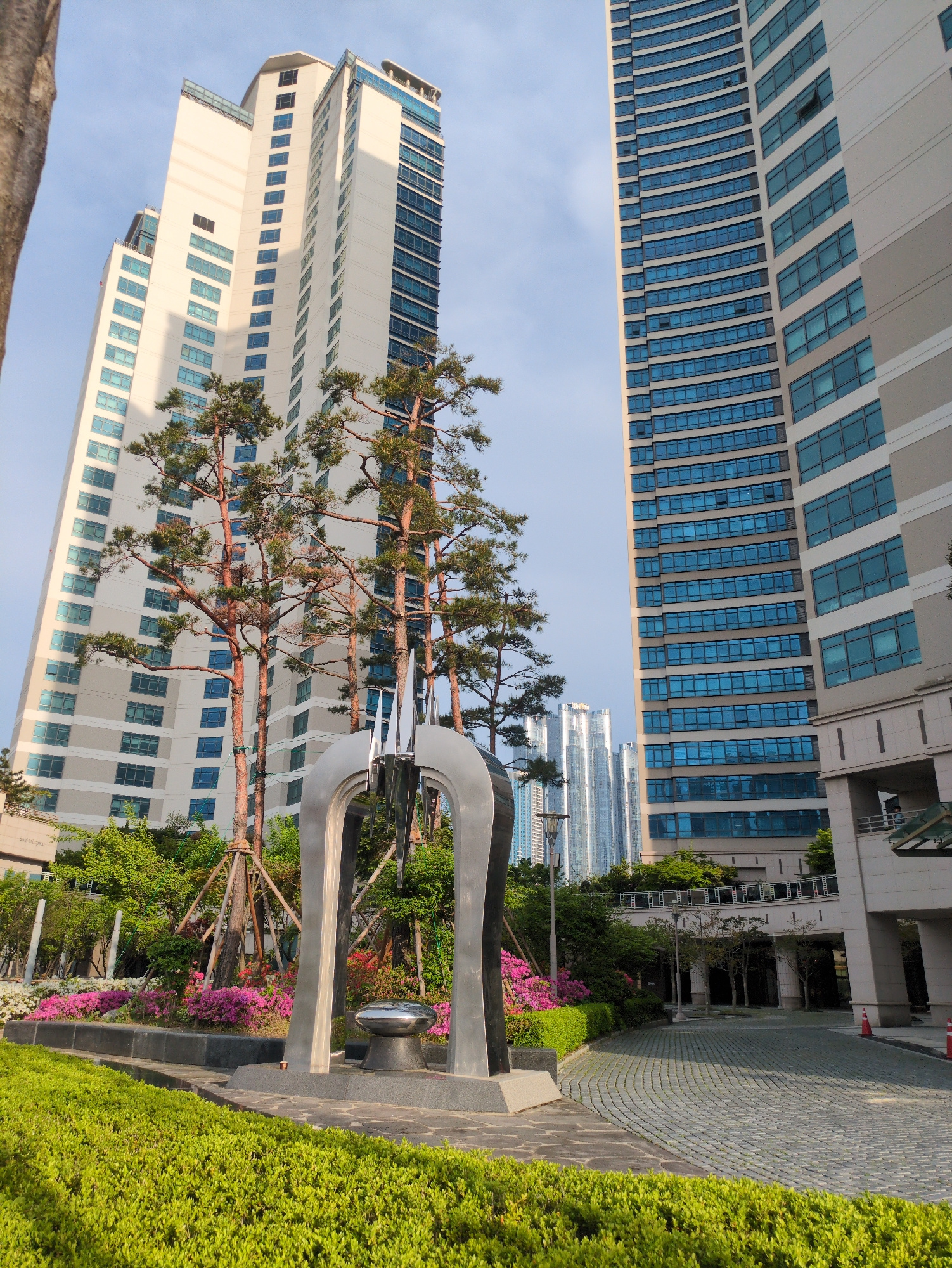 The image displays a modern urban landscape characterized by tall, sleek buildings and well-maintained green spaces under a bright, clear sky. Two prominent high-rise buildings frame the scene. The b…read more