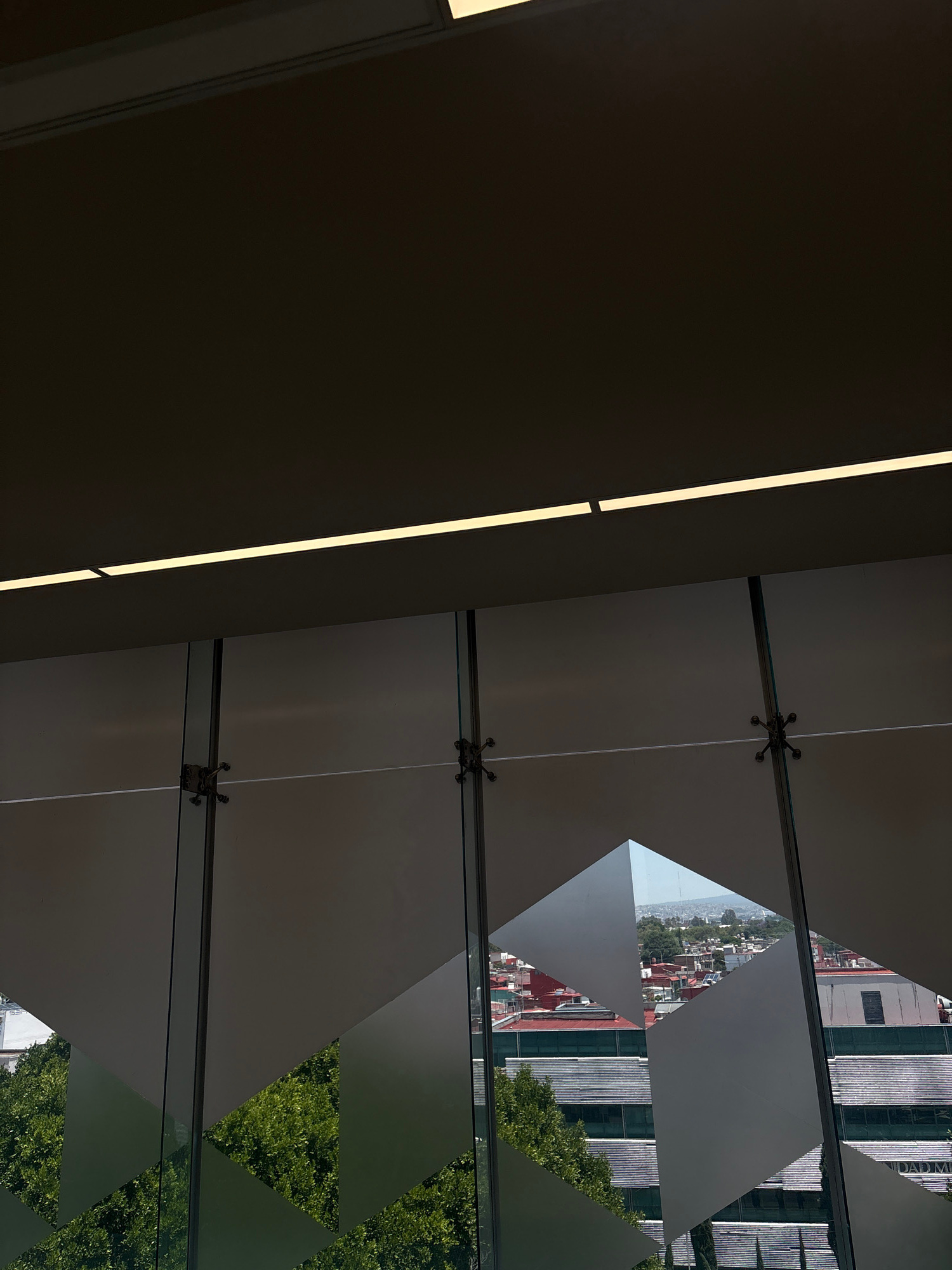 The image depicts a geometric window design, likely part of a building facade, through which the city of Puebla, Mexico, is visible. The windows consist of triangular or diamond-shaped panes, creating…read more