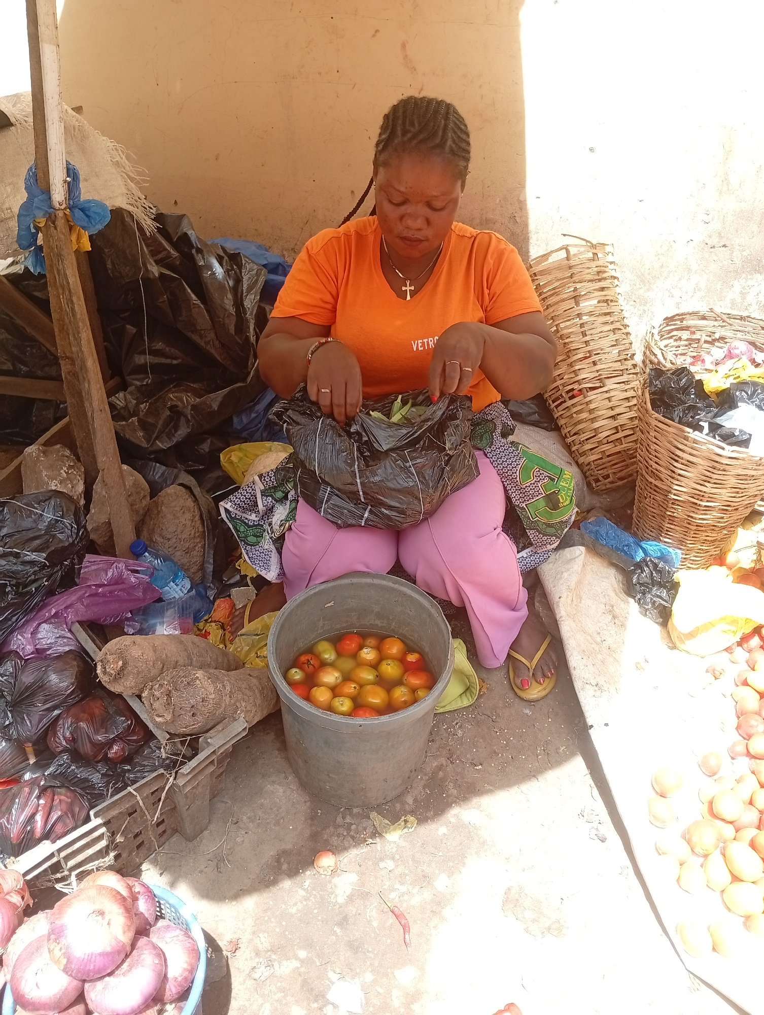 The image shows a woman in an orange t-shirt sitting in a market stall surrounded by produce. She is holding a black plastic bag and looking down at it. In front of her is a bucket of tomatoes soaking…read more