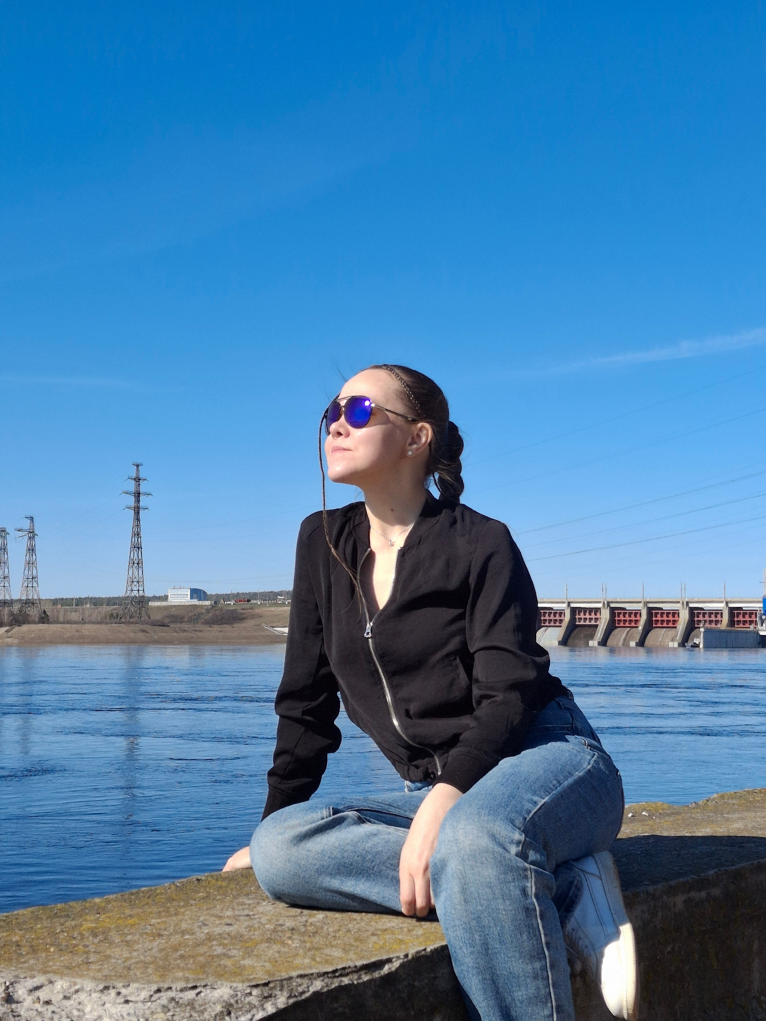 The image, correctly oriented, shows a young woman sitting on a concrete or stone embankment under a clear, bright blue sky. She is viewed from the side, looking towards the right. She wears a black z…read more