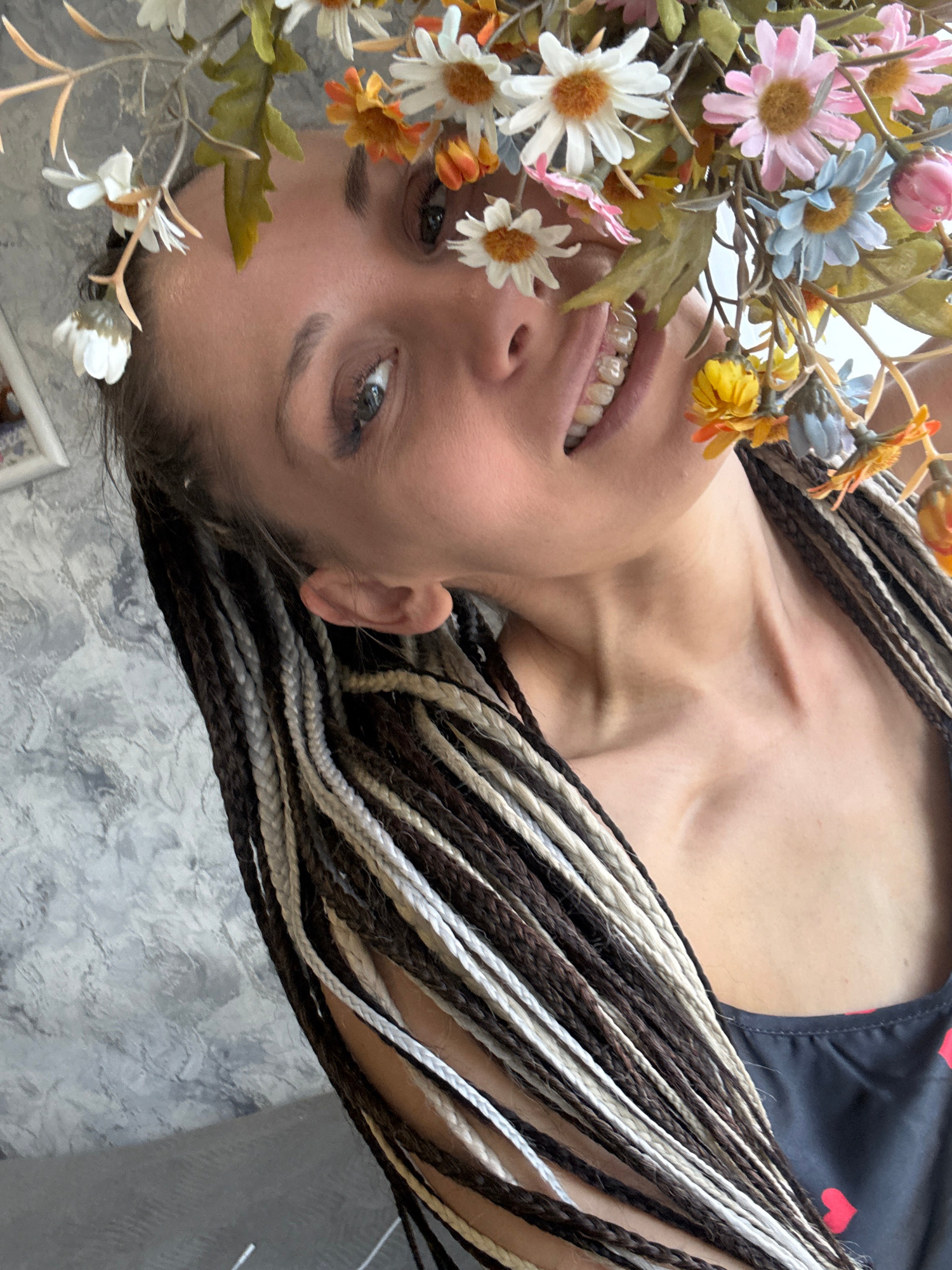 The image is a portrait of a woman with braided hair, featuring alternating dark brown and blonde strands. She is wearing a black top with a pattern of red hearts. The woman is smiling, and a bouquet…read more