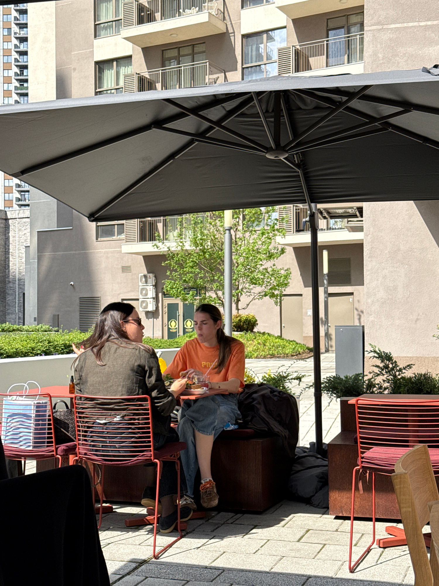 An outdoor scene in Belgrade, Serbia, captures two women enjoying a sunny day on a cafe or restaurant patio. The image is taken from a slightly elevated perspective, looking down and across the seatin…read more