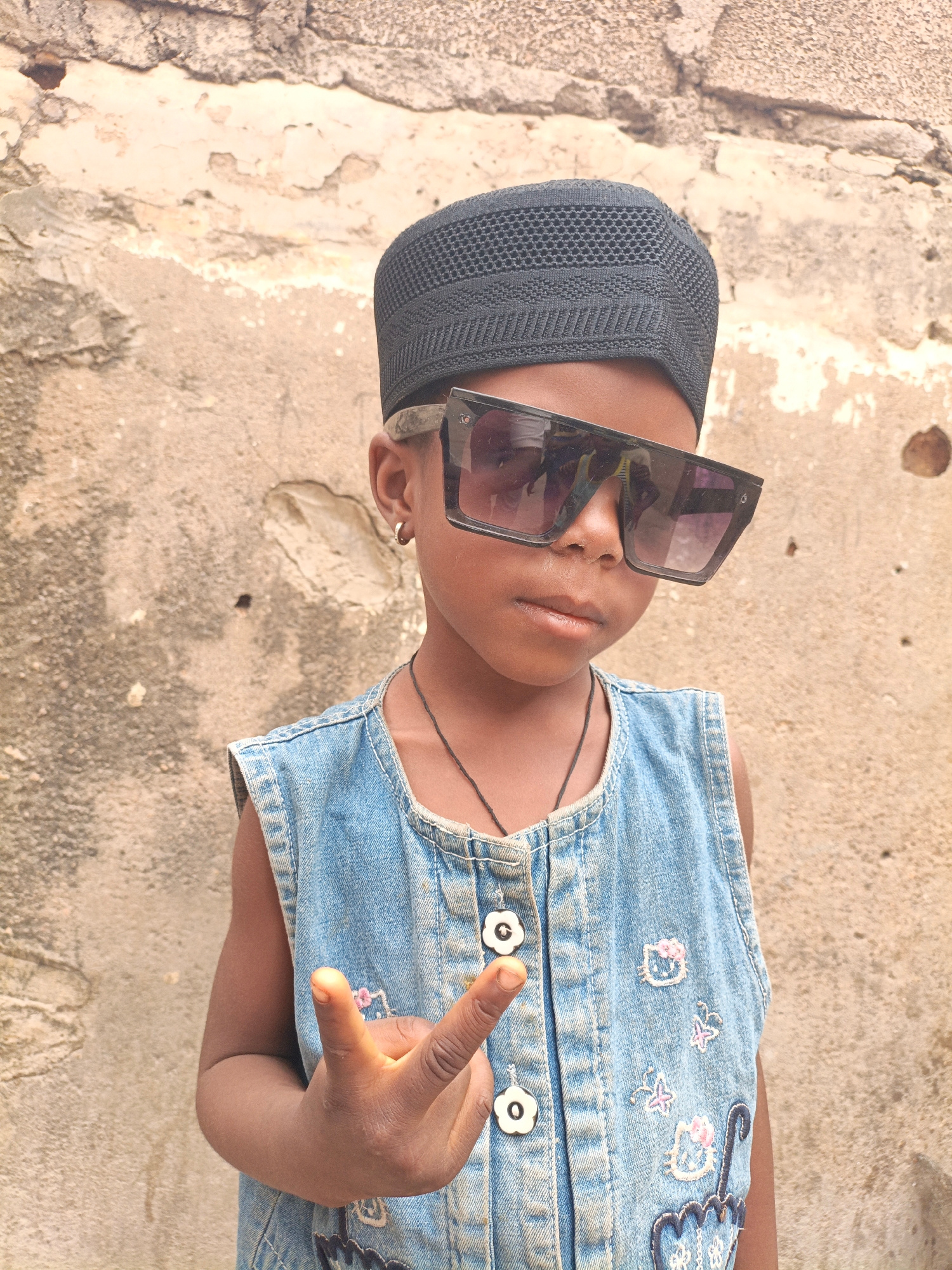 A young child stands in front of a textured beige wall. The child wears a black kufi cap, oversized sunglasses, and a sleeveless denim dress with decorative buttons and embroidered designs. The child…read more
