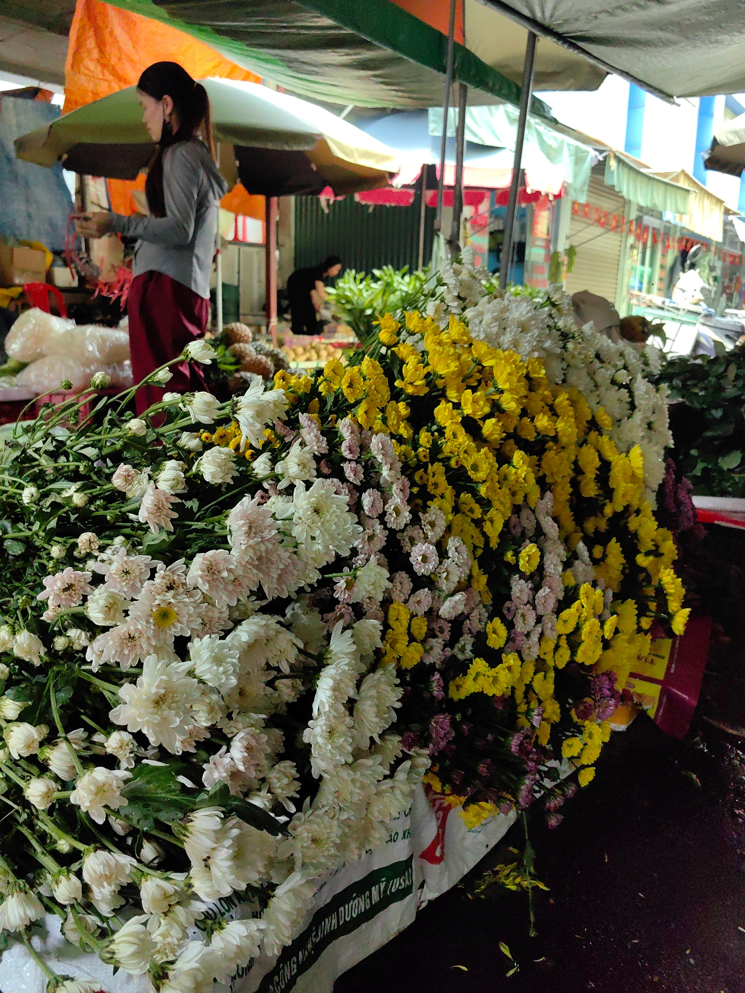 A street flower market in Ha Long Ward, Vietnam, features piles of white, yellow, and pink chrysanthemums. A woman with a ponytail, wearing a gray shirt and red pants, stands in the background. Other…read more