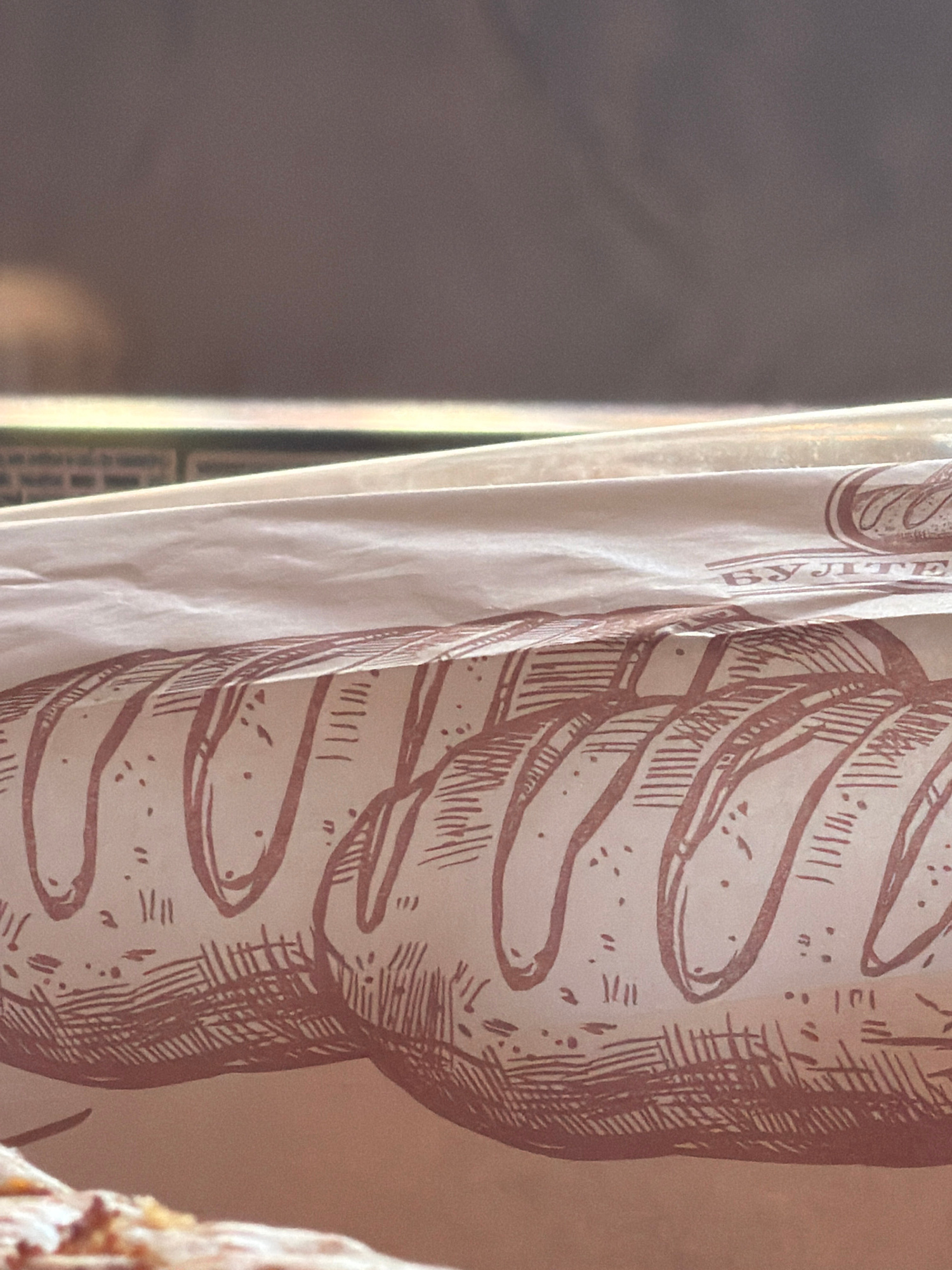 The image shows a close-up of a paper bag with a printed design resembling a baguette. The bag appears to be from a bakery or food establishment, indicated by the word "BYTTE" visible on the bag. The…read more