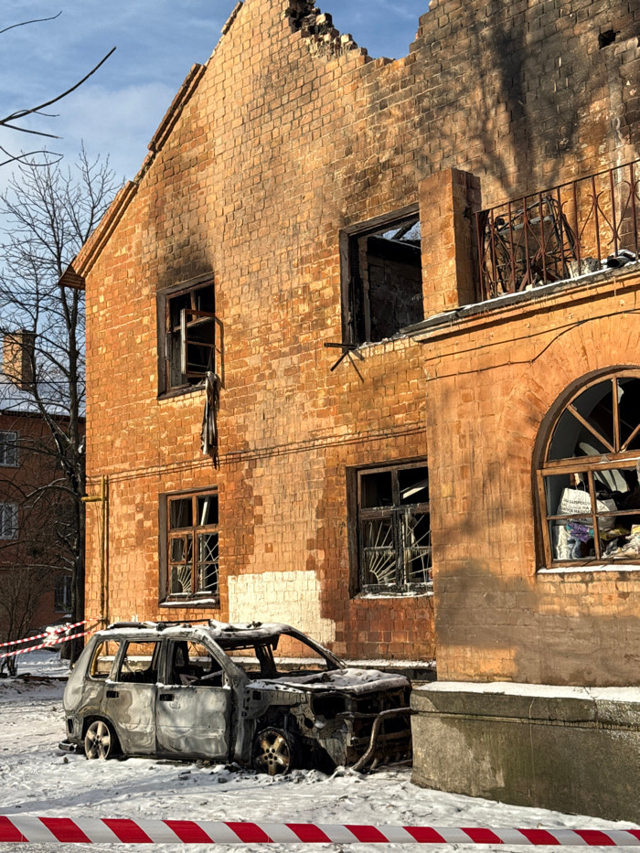 The image depicts the severely fire-damaged three-story brick building located at Hostels on Yaroslavska Street, 40, Kyiv, Ukraine. The structure's upper sections, including the roofline and portions…read more