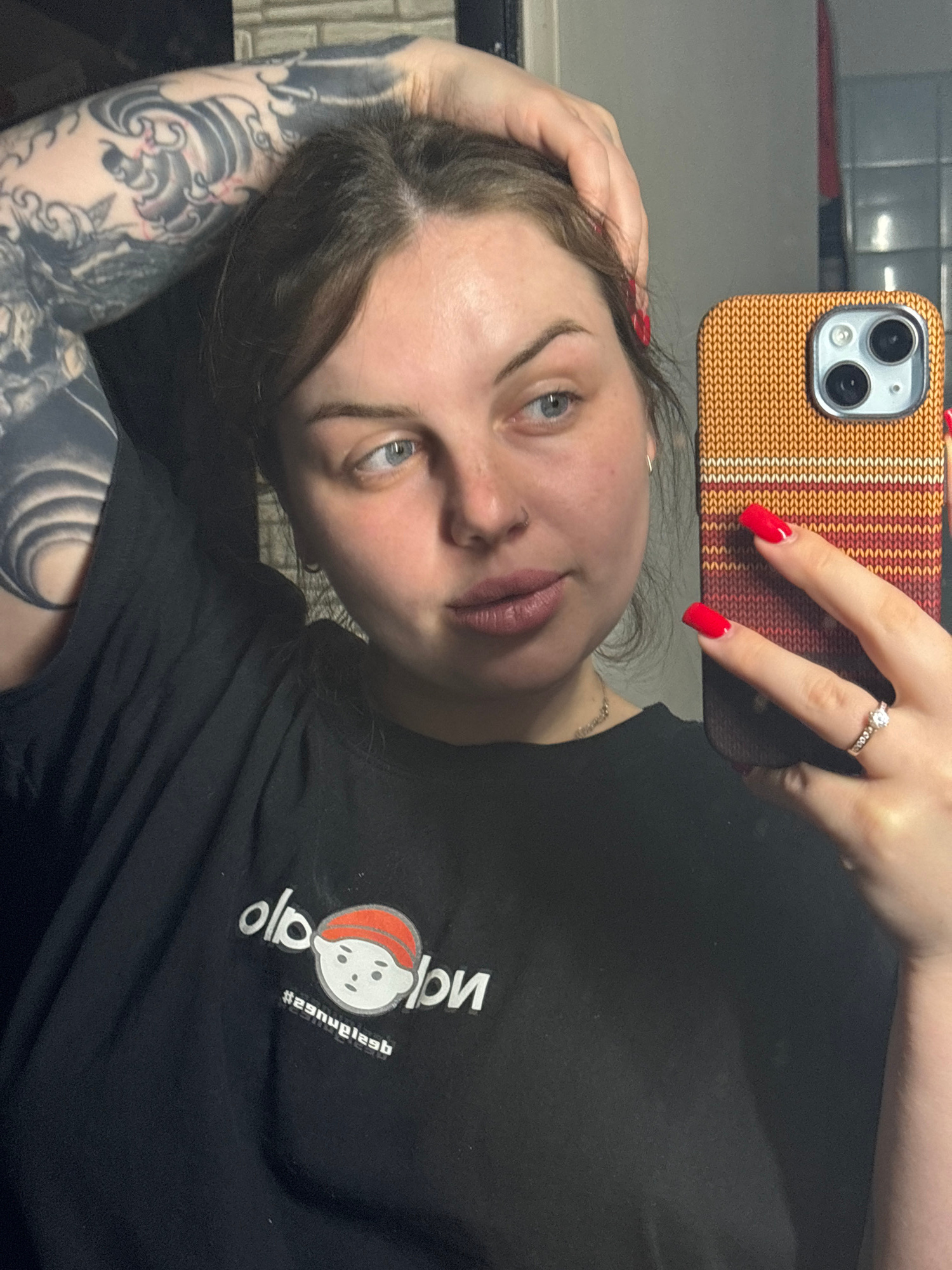 A fair-skinned woman with blue eyes and dark hair is taking a selfie with a phone in a knit-textured orange and brown case. She wears a black T-shirt with a white, cartoon-style graphic and text, and…read more