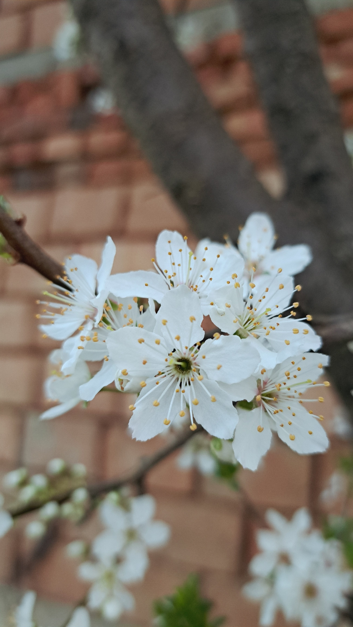 The image shows a cluster of white flowers with prominent yellow-tipped stamens, likely blossoms of a fruit tree. The flowers are positioned in the center of the frame, with a brown branch visible atβ¦read more