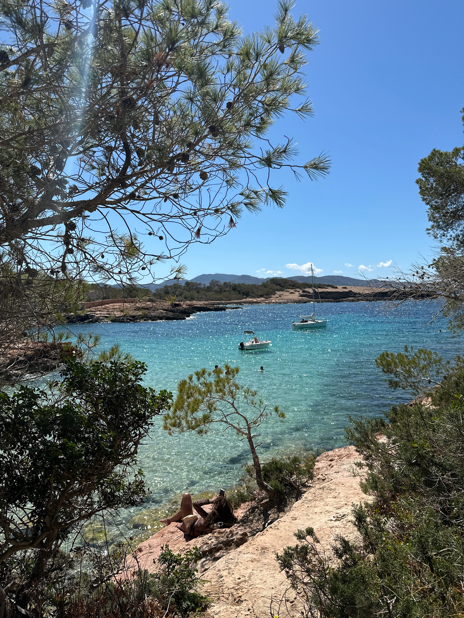 The image shows a cove in Sant Antoni de Portmany, Spain. The view is partially framed by trees in the foreground. Clear turquoise water fills the cove, reflecting sunlight. Two boats are anchored inβ¦read more