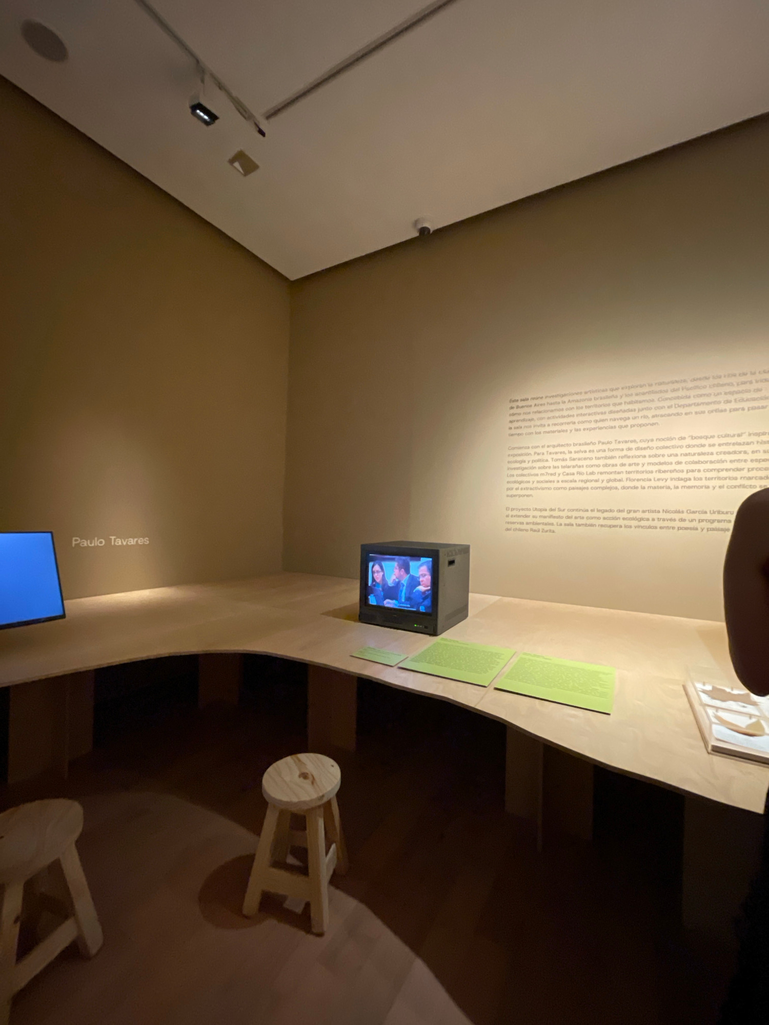 The image depicts an art exhibition in Buenos Aires, Argentina featuring the work of Paulo Tavares and other artists. The location is an indoor space with a high ceiling and beige-colored walls. The e…read more