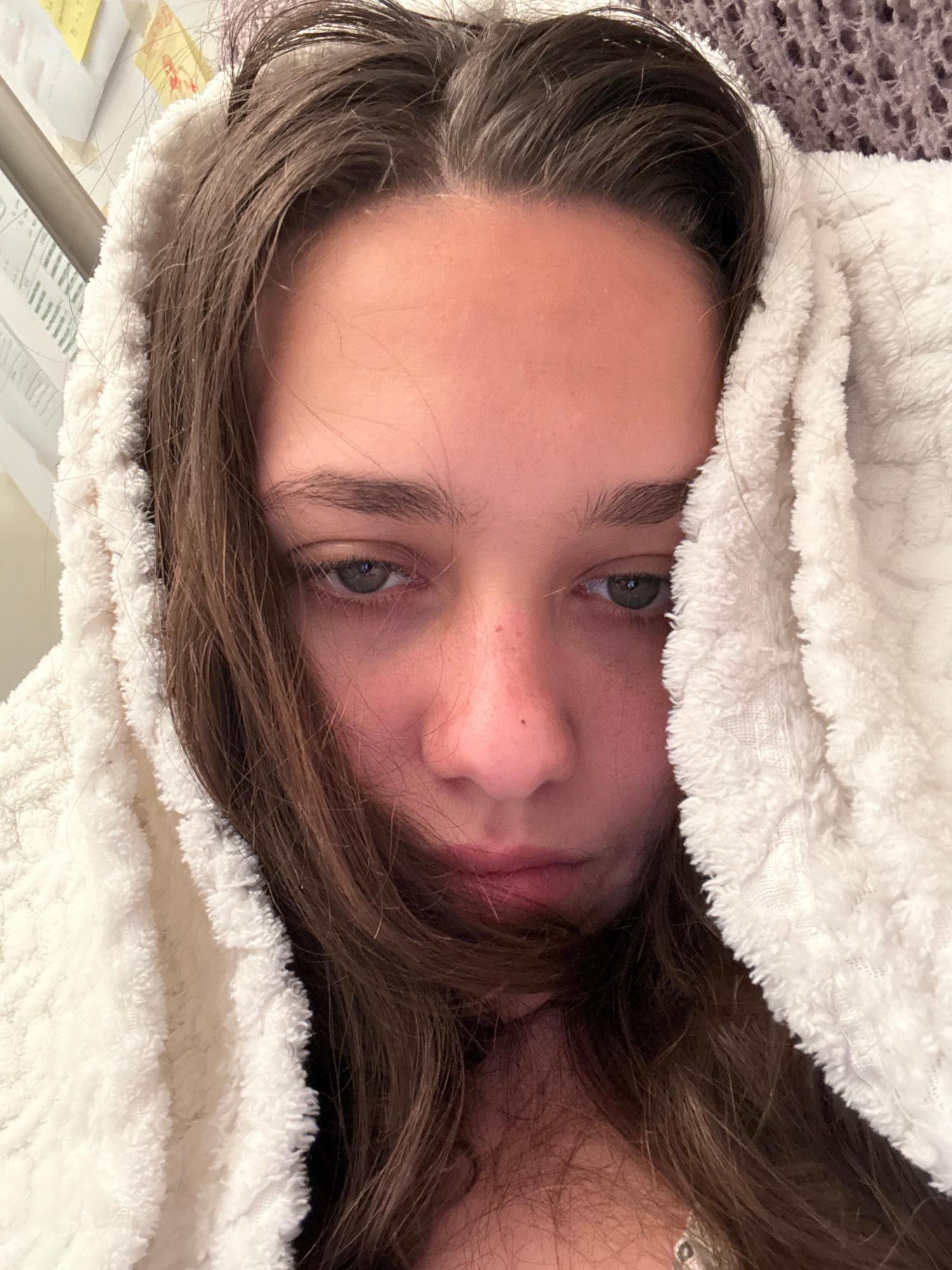 This close-up portrait, captured with a slightly rotated perspective, shows a person lying down and looking directly into the camera. The scene takes place indoors, with the provided context indicatin…read more