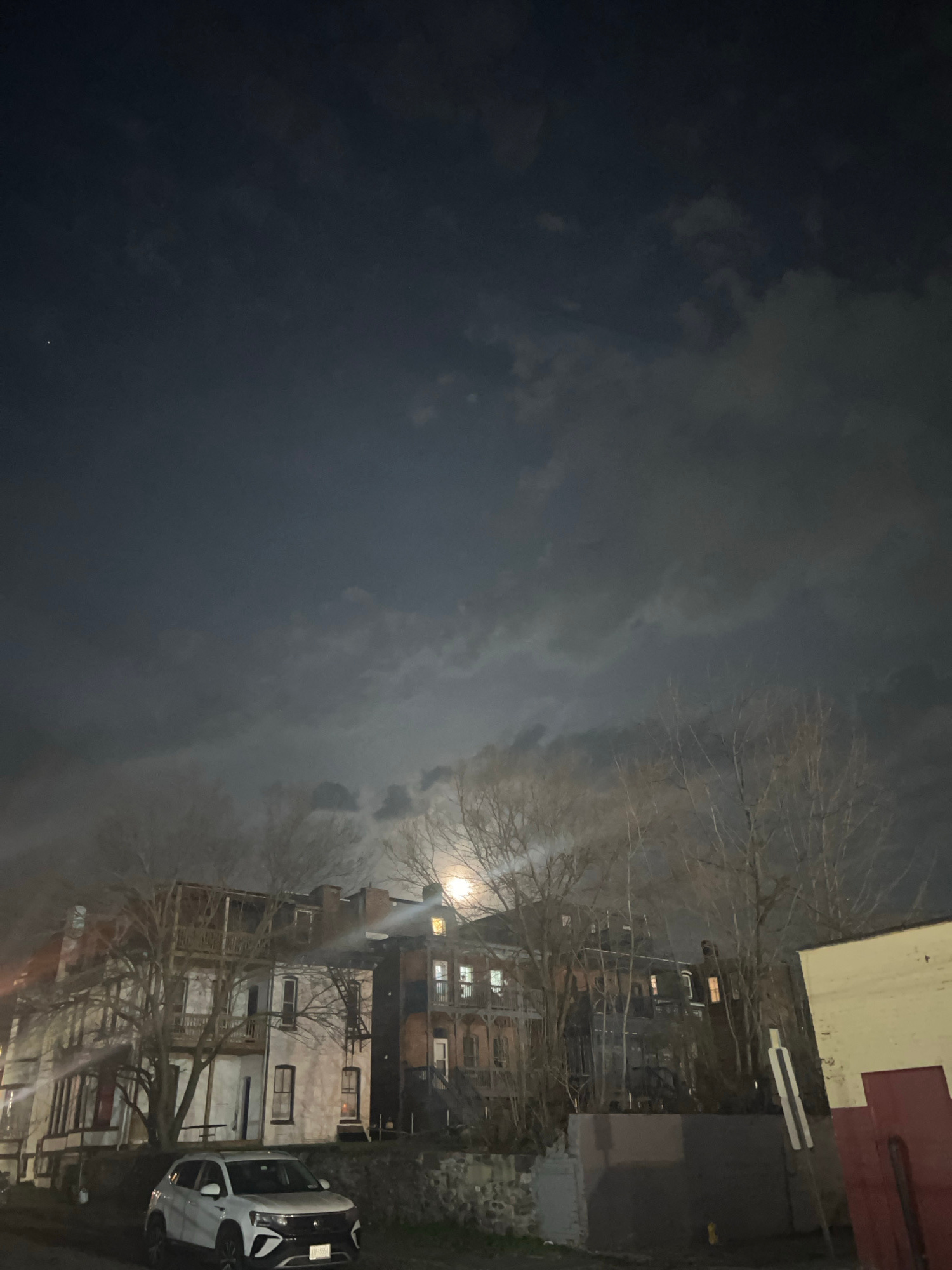 At night, the image shows the City of Newburgh, United States of America, where a full moon illuminates the city skyline. The sky is overcast, with thick clouds obscuring parts of the moon. Buildings…read more