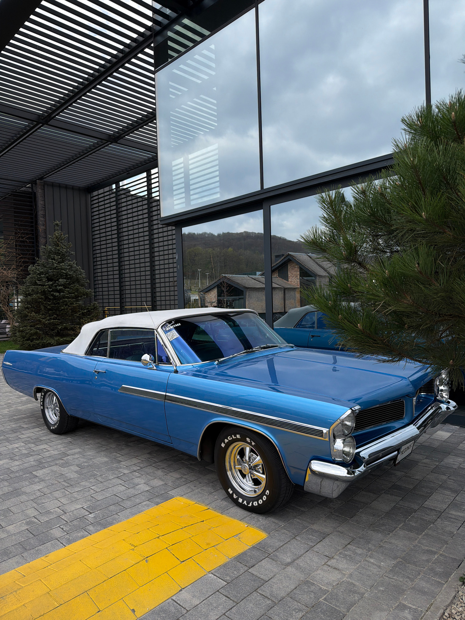 A light blue classic convertible car with a white soft top is parked on gray paver stones, partially obscuring a bright yellow painted stripe on the ground. The car features chrome bumpers, a prominen…read more