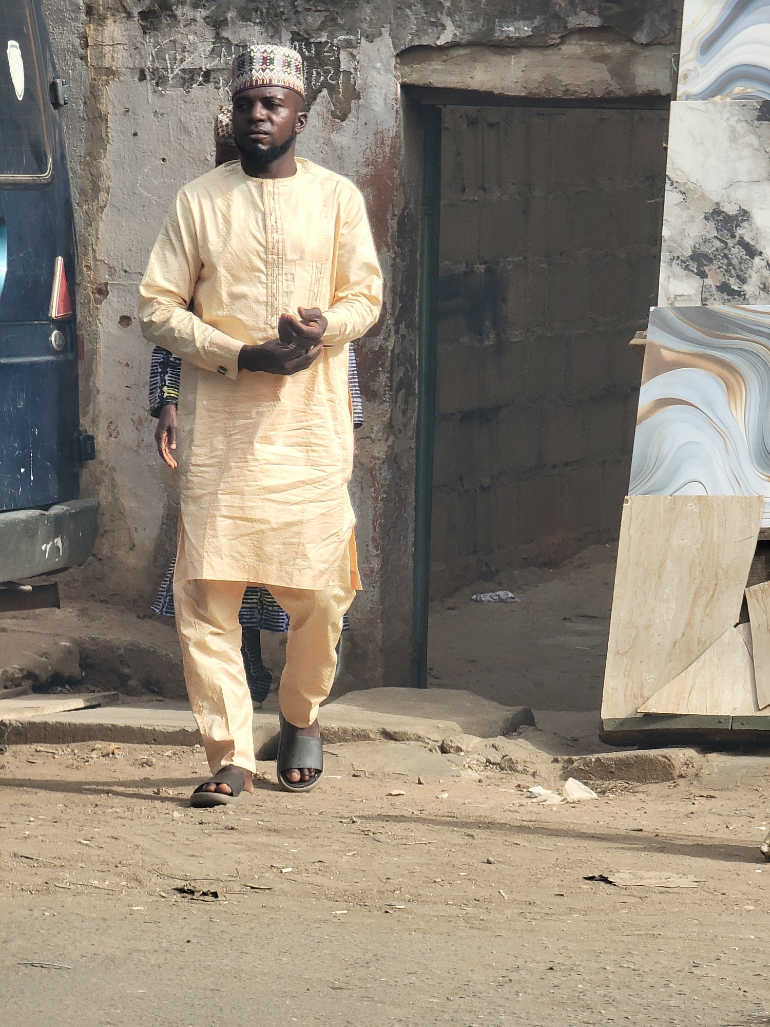 An adult Black male stands on a concrete sidewalk next to a street in the city of Maiburiji, Nigeria. He wears a light yellow, traditional, long-sleeved garment with matching pants and a patterned cap…read more