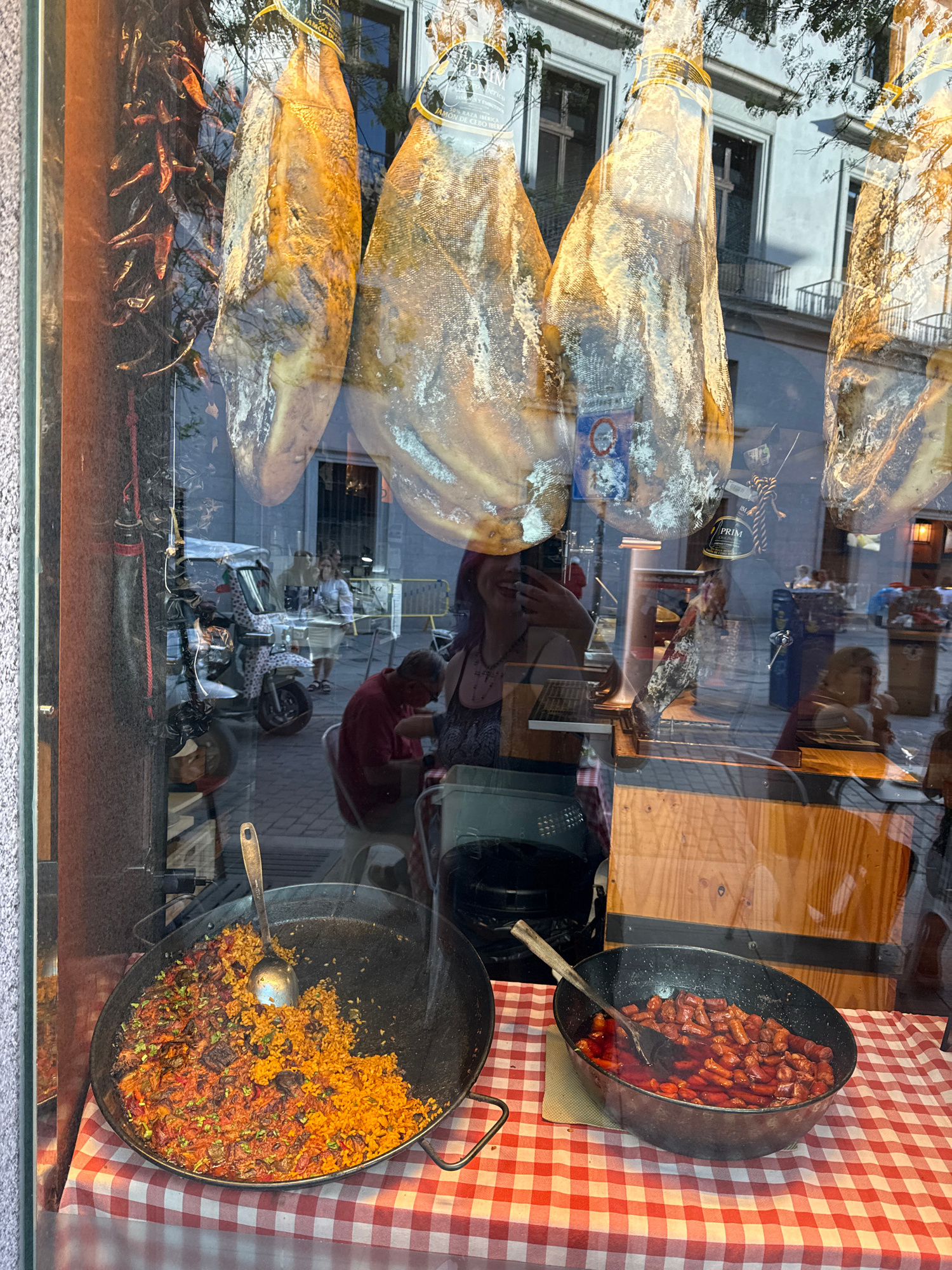 A slightly elevated angle captures a view through a window, likely in Madrid, Spain, as evidenced by the presence of Jamón ibérico and paella, common local food products. On display within the window…read more