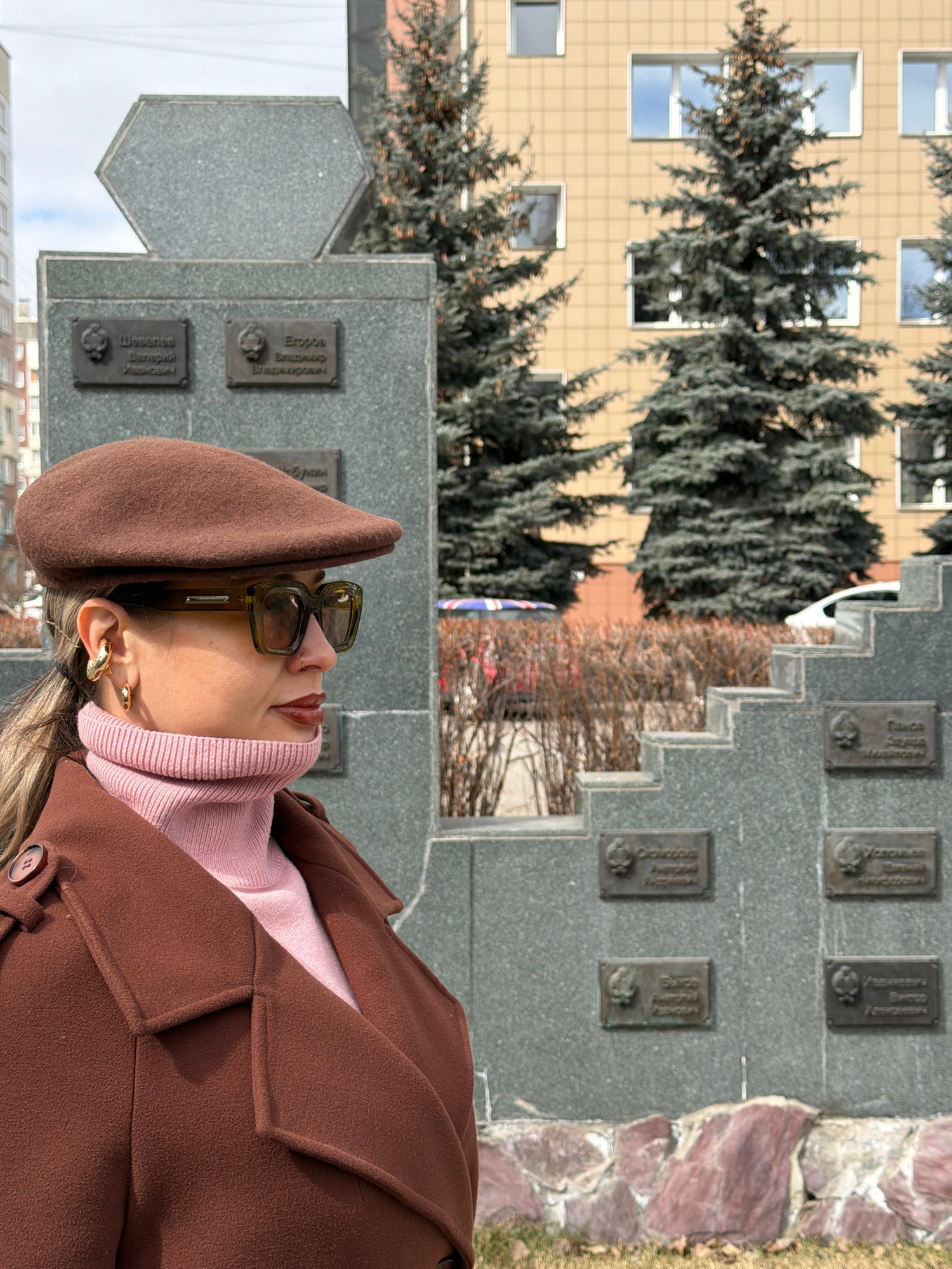 The image captures a person in the foreground against a backdrop of a memorial site, architectural structures, and trees under bright daylight. The scene suggests a public space in Krasnoyarsk, Russia…read more