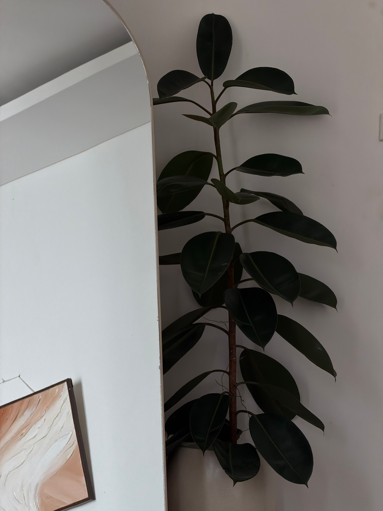 A high-angle shot reveals a rubber plant placed on top of a white surface. The plant has a long, brown stem and large, glossy green leaves that point in various directions. The white surface appears t…read more