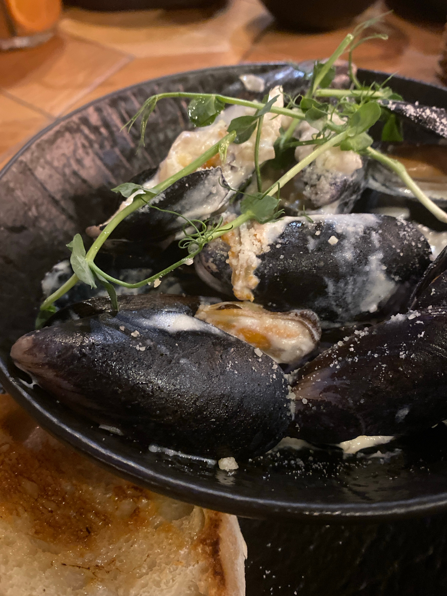 A top-down shot displays a black dish filled with mussels covered in a creamy sauce and sprinkled with what appears to be salt or cheese. Garnishing the dish are sprigs of pea shoots. Next to the dish…read more