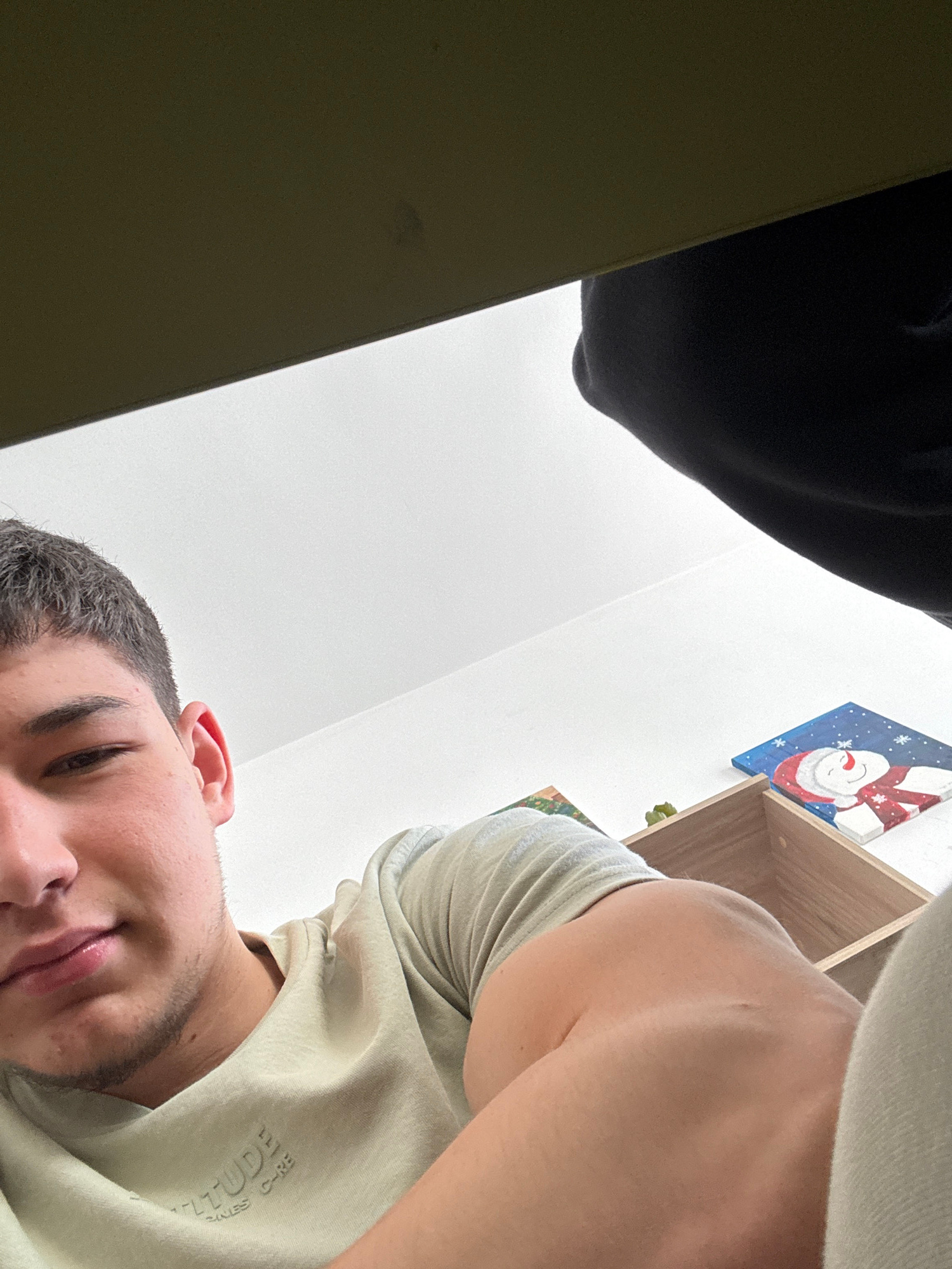 A young man is captured in a low-angle, indoor close-up shot, likely taken in Zlatograd, Bulgaria. His head is tilted to the left, and he looks towards the camera with a slight smirk or relaxed expres…read more
