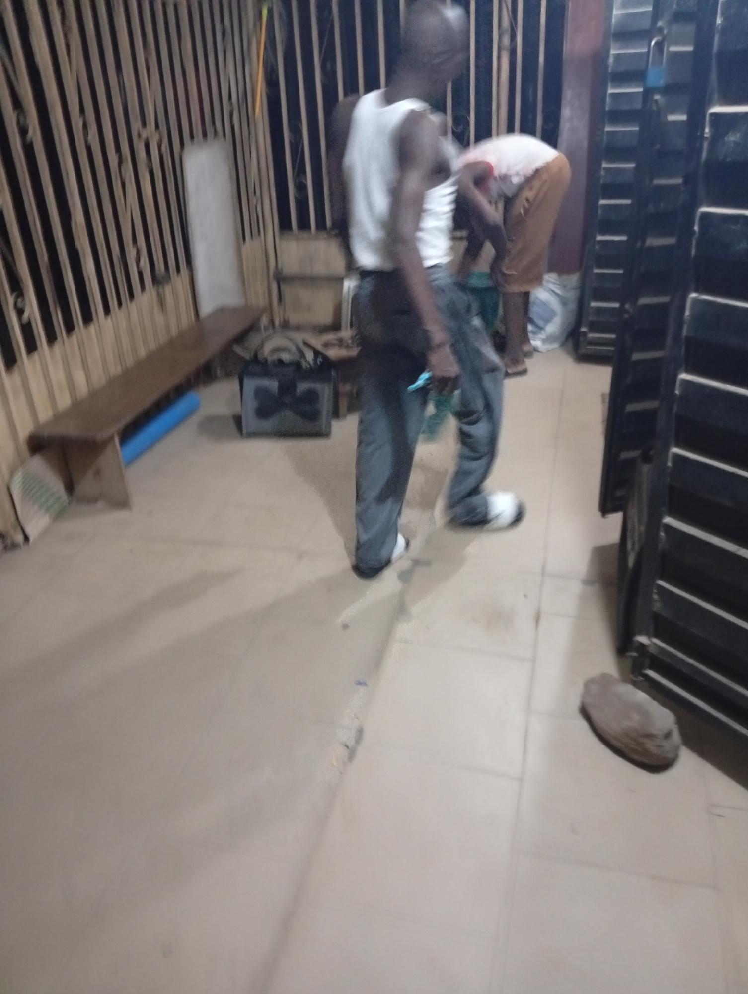 The scene appears to be in a residential or commercial space in Adankolo, Nigeria. The area is tiled. Two individuals are present. The first person is an adult male wearing a white tank top and grey p…read more