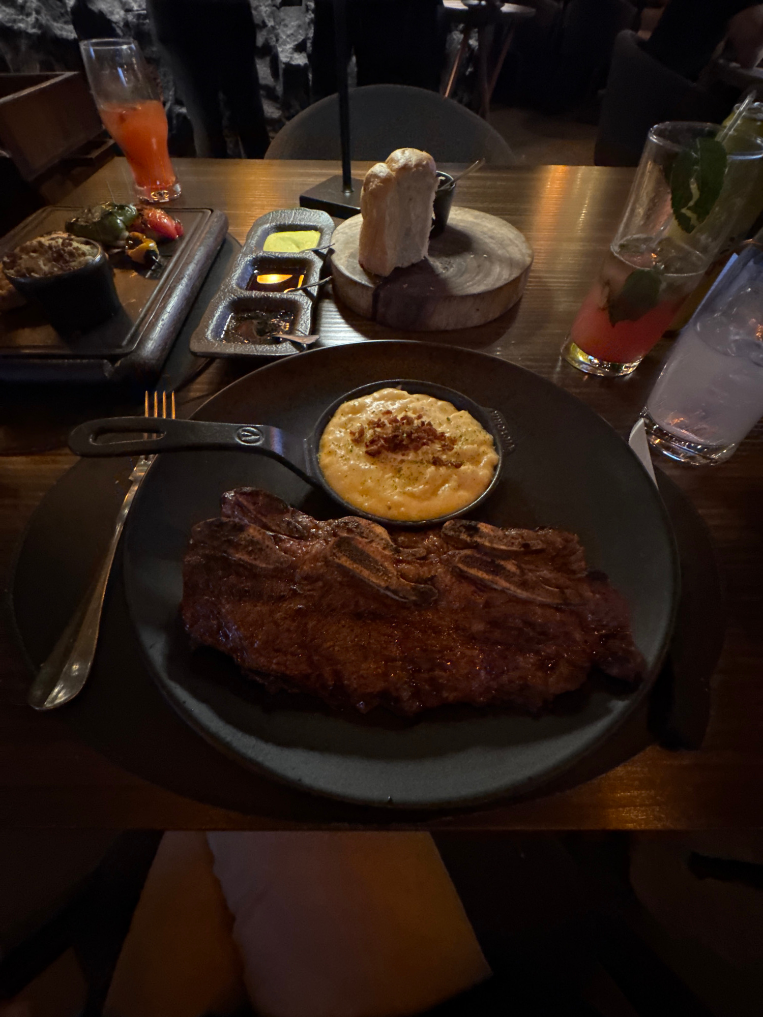 The image captures a top-down view of a meal on a wooden table. The main focus is a dark plate with a grilled steak and a small bowl of macaroni and cheese topped with bacon bits. A fork and knife are…read more